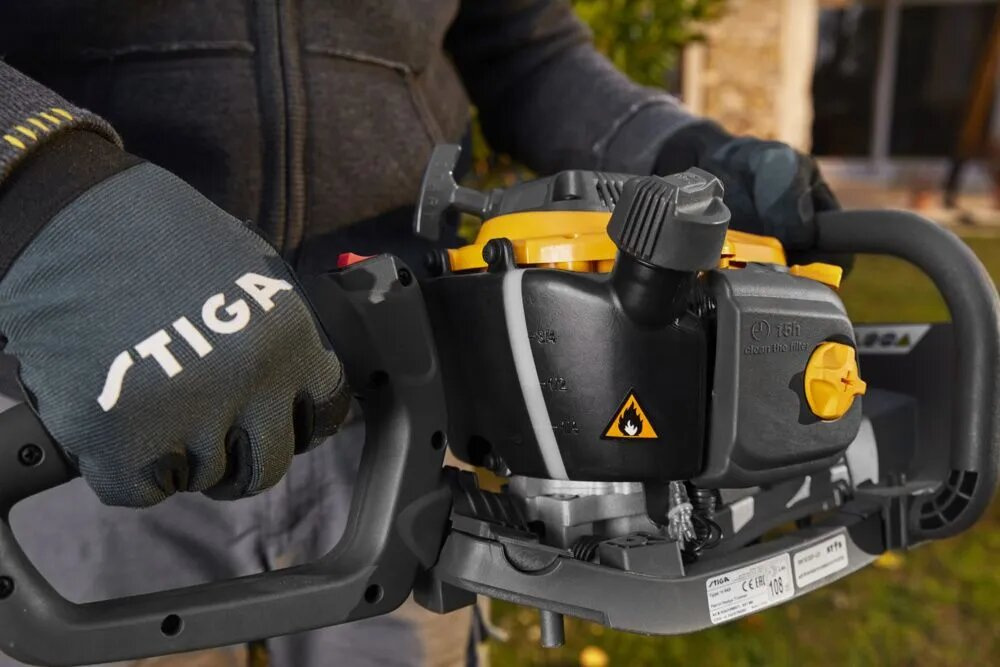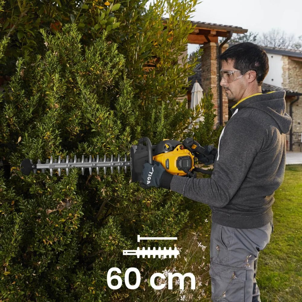 Двосторонній ніж довжиною 60 см з діаметром різу до 27 мм дозволяє швидко формувати крони та живоплоти. Компактний паливний бак 0,26 л дає свободу пересування без кабелів, а збалансована конструкція та невелика вага 5,6 кг роблять роботу комфортною навіть при тривалому використанні.