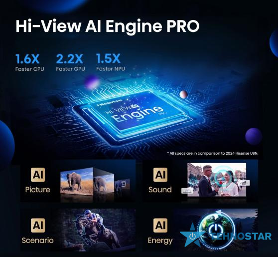 Телевізори Hisense використовують передові технології ШІ для точного аналізу сцен і покращення контрасту. Контент SDR може бути покращений до якості, подібної до HDR, з чіткими деталями, багатими кольорами та глибоким контрастом.