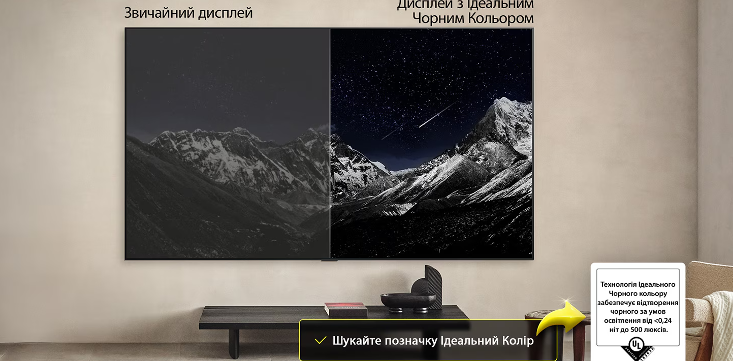 Ідеальний чорний колір сертифікований UL та забезпечує справжній рівень чорного, покращуючи яскравість і контрастність, незалежно від того, чи навколо вас яскраво, чи темно.