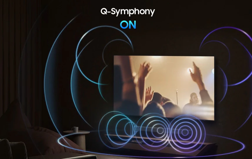 Насолоджуйтесь гармонійним і повноцінним звучанням. Технологія Q-Symphony дозволяє телевізору й саундбару працювати одночасно, не вимикаючи динаміки жодного з пристроїв.