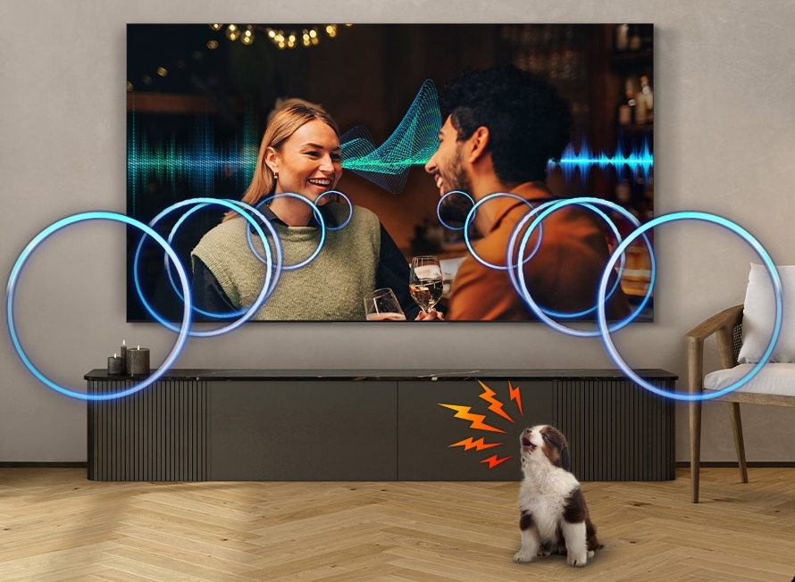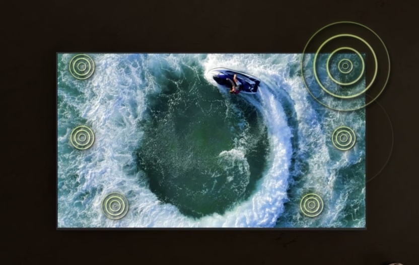 Перемістіться в центр подій. Завдяки динамікам 4.2.2.ch цей телевізор відтворює потужний звук уздовж усього екрана. Завдяки відстеженню за допомогою штучного інтелекту звук рухається разом з об'єктами на екрані, покращуючи об'ємний звук і надаючи йому реалістичності.