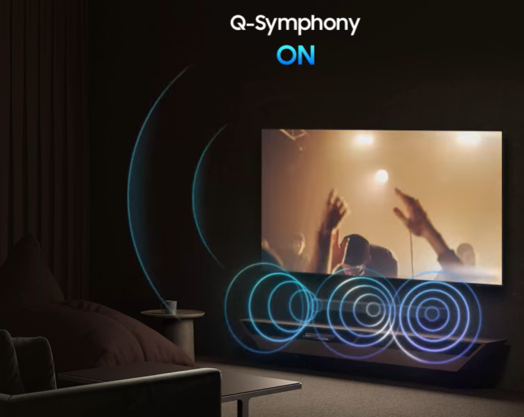 Насолоджуйтесь гармонійним і повноцінним звучанням. Технологія Q-Symphony дозволяє телевізору й саундбару працювати одночасно, не вимикаючи динаміки жодного з пристроїв.