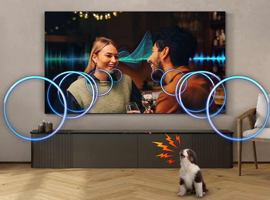 Перемістіться в центр подій. Завдяки динамікам 4.2.2.ch цей телевізор відтворює потужний звук уздовж усього екрана. Завдяки відстеженню за допомогою штучного інтелекту звук рухається разом з об'єктами на екрані, покращуючи об'ємний звук і надаючи йому реалістичності.