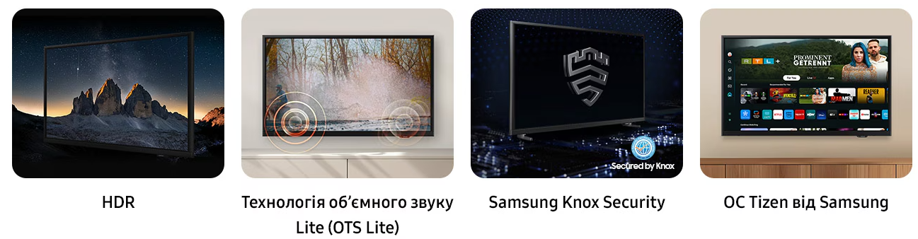 * Samsung Knox Security поширюється на телевізори Samsung на базі ОС Tizen®, випущені з 2015 року. * Оновлення програмного забезпечення для захисту надається протягом трьох років з моменту запуску продукту. * Потрібне останнє оновлення програмного забезпечення.