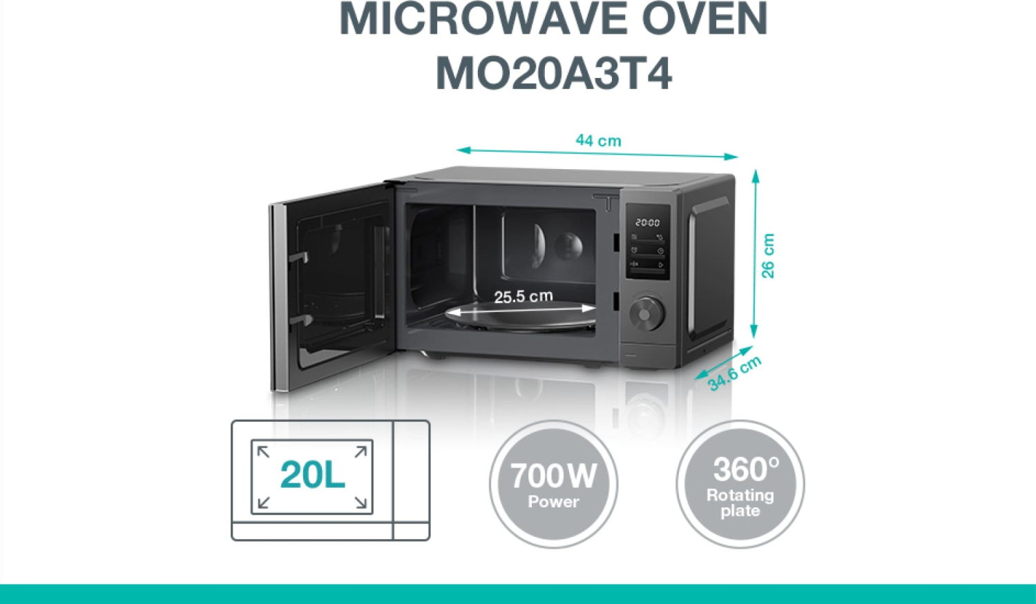 Об'єм і потужність: 20 л, мікрохвильова потужність 700 Вт, 5 рівнів потужності (100%, 70%, 50%, 30%, 10%).