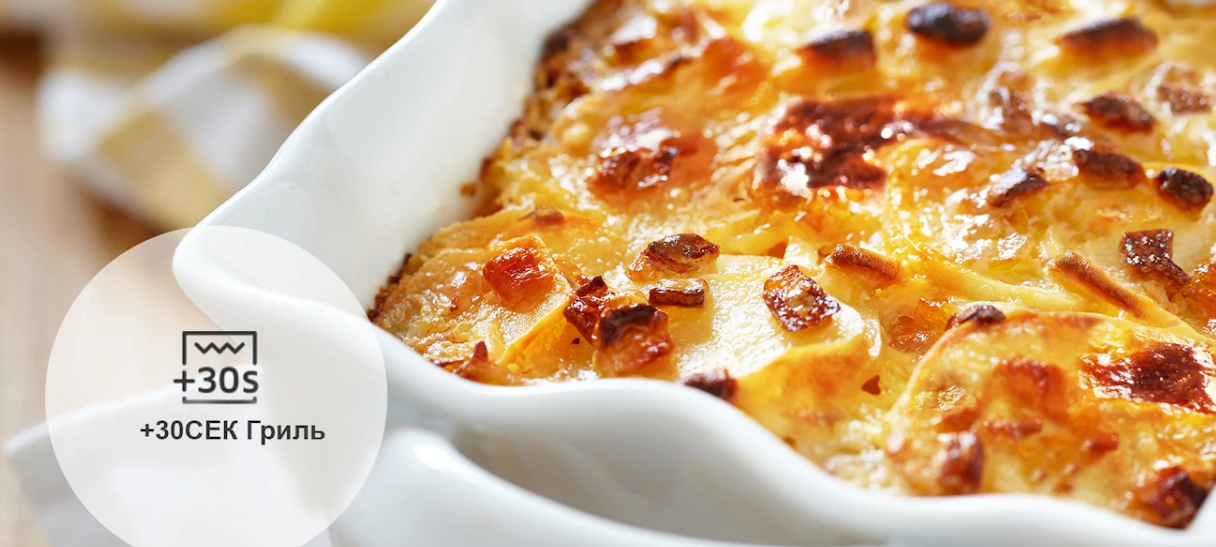 Функция "Разогрев с грилем" (+30 CEK Гриль) обеспечивает идеальную текстуру и цвет Вашего блюда, благодаря чему оно выглядит удивительно аппетитным. Время приготовления продлевается на 30 секунд, чтобы получить подрумяненное, хрустящее блюдо с использованием гриля.
