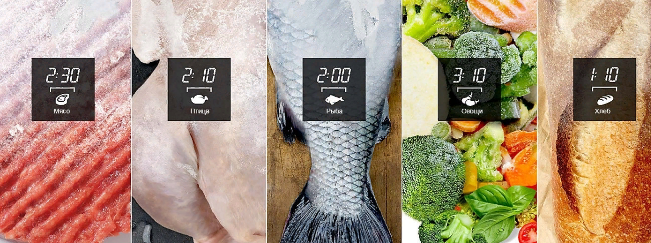 Функция "Быстрая разморозка" позволяет быстро и равномерно разморозить продукты. Специальный алгоритм автоматически рассчитывает время разморозки для 5-ти часто используемых типов продуктов, благодаря чему разморозка ингредиентов занимает меньше времени.