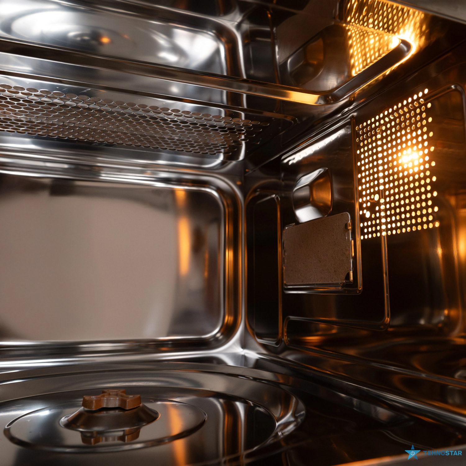 Внутрішнє покриття камери з нержавіючої сталі забезпечує легкість у догляді та довговічність приладу. Поворотний стіл діаметром 27 см сприяє рівномірному прогріванню страв.