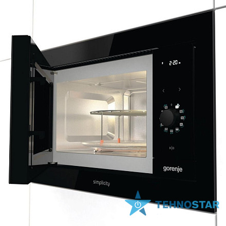 Gorenje BM235G1SYB (MXY55Z) — це вбудована мікрохвильова піч із грилем, яка поєднує стильний дизайн, зручність використання та багатофункціональність. Чорне оздоблення з нержавіючої сталі додає кухні витонченості та преміум вигляду, а сучасний дисплей і сенсорне управління роблять роботу з піччю легкою та приємною.