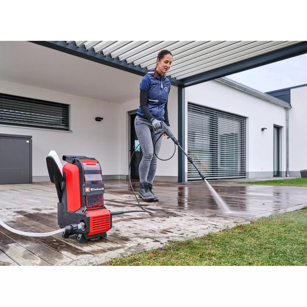 Einhell HYPRESSO 36/105 — акумуляторна мінімийка з тиском до 105 бар для миття автомобілів, фасадів, терас і садових меблів без прив'язки до мережі. Живлення — два акумулятори 18 В системи Power X-Change, що разом дають 36 В. Безщітковий двигун PurePOWER без іскріння та зносу щіток забезпечує тривалий ресурс — на двигун діє 10-річна гарантія після реєстрації. Мийка забирає воду як із водопроводу, так і з будь-якої ємності — відра, бочки, водойми — завдяки всмоктувальному шлангу 5 м у комплекті. Багатофункціональна насадка 4-в-1 миттєво перемикається між точковим струменем, широким розпилом, брудовою фрезою та режимом розпилення. Режим ECO знижує тиск для делікатного миття та подовжує час роботи на одному заряді. Захисний кожух Water-Splash-Guard оберігає акумулятори від бризок. Рукоятка Softgrip зручна для тривалого використання.