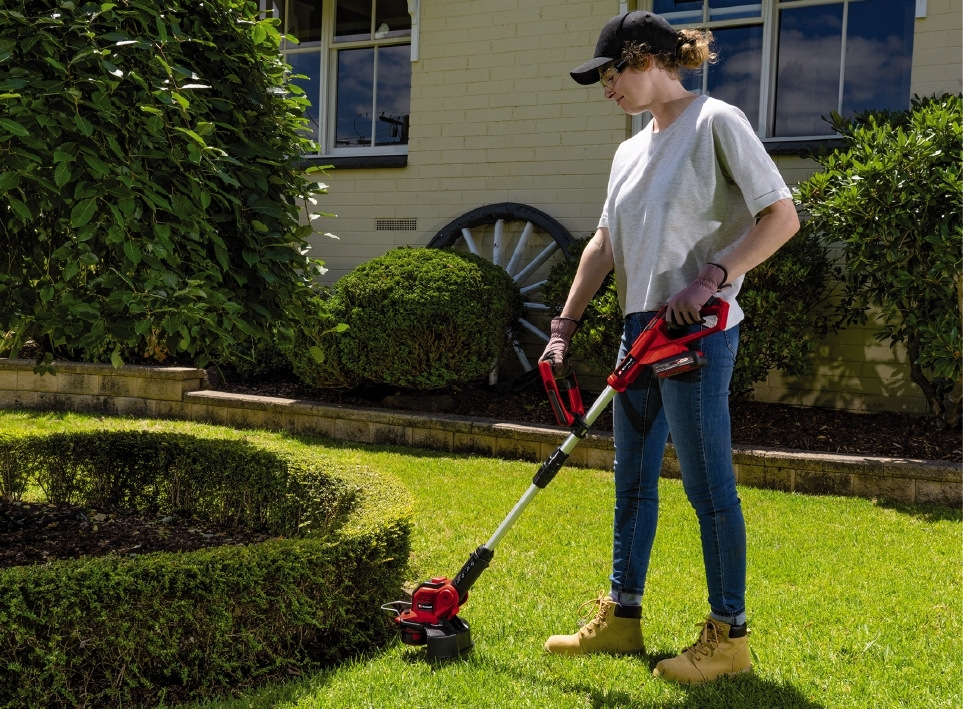 Тример є пристроєм сімейства Einhell Power X-Change. Батарея і зарядний пристрій Power X-Change можуть використовуватися для всіх пристроїв сімейства Power X-Change. Телескопічна довга ручка з плавним регулюванням тримеру GE-CT 18/28 Li TC - Solo може бути налаштована для зручної роботи користувачів різного росту. Навіть складні умови роботи, такі як вертикальні поверхні і кромки газонів, будуть легко і комфортно оброблені завдяки м’якій накладці на ручці, плавному регулюванню додаткової рукоятки і головою двигуна, яку може повернути на +/- 180° і нахилятись у трьох різних положеннях. Обмежувач захисту квітів Flowerguard захищає квіти, декоративні рослини та інші чутливі об’єкти від пошкоджень.
