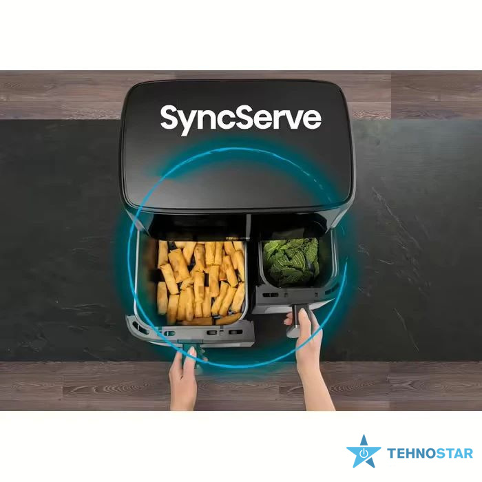 Синхронізує роботу обох кошиків, щоб усе було готове одночасно. Ця розумна функція узгоджує час приготування в обох кошиках, забезпечуючи, щоб страви були гарячими, свіжими та готовими до подачі в один момент.
