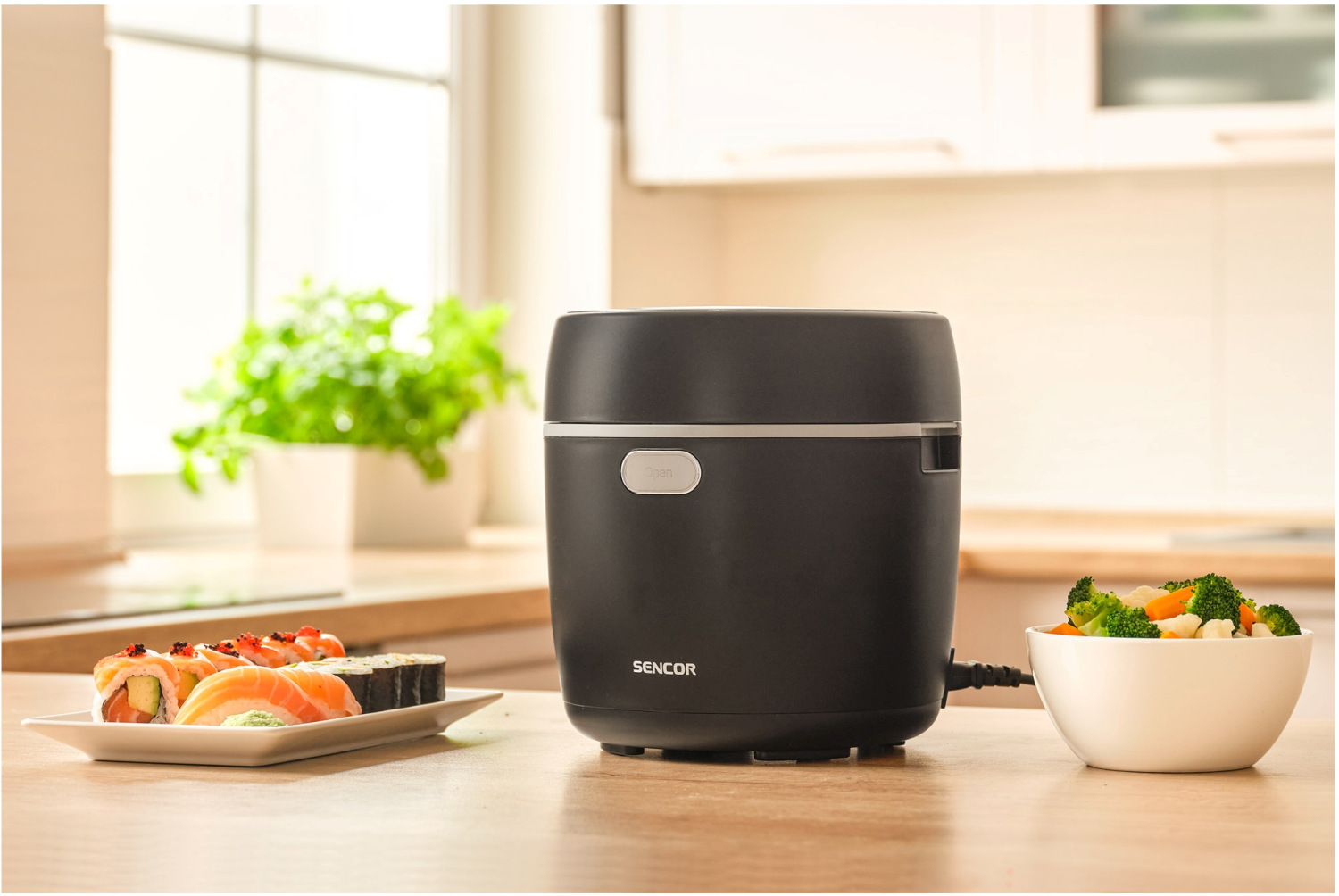 Попри компактні розміри (об’єм 0,6 л), прилад має 8 автоматичних програм приготування: білий рис, коричневий рис, різотто, суші, пиріг, швидке приготування, низьковуглеводний режим і приготування на пару.