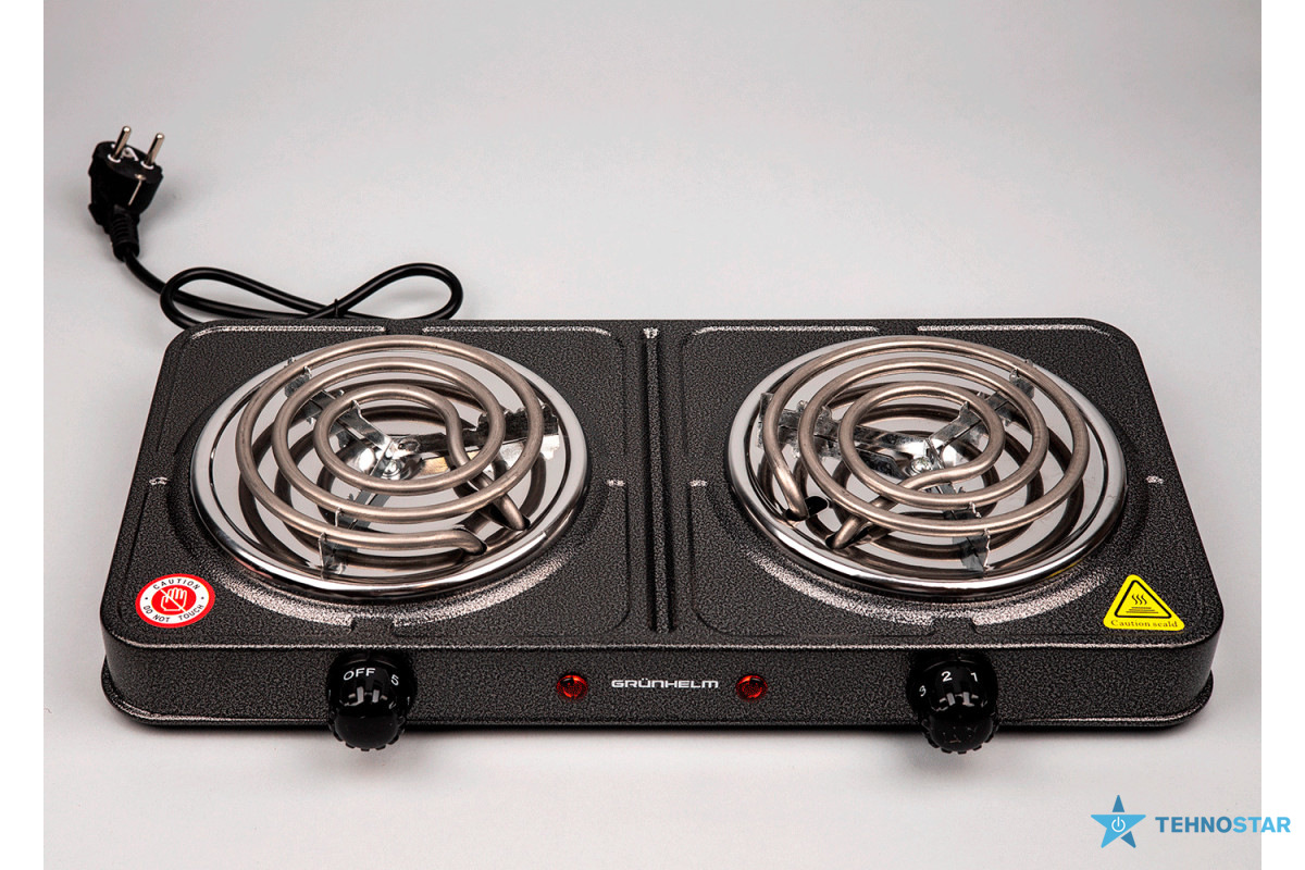 Завдяки двом конфоркам з потужністю 1000 Вт кожна, прилад дозволяє одночасно готувати різні страви, економлячи час і зусилля. Вузькі ТЕНи забезпечують швидкий та рівномірний нагрів, а емальована робоча поверхня полегшує догляд та підтримання чистоти. Механічні поворотні перемикачі дозволяють точно регулювати температуру, роблячи процес приготування інтуїтивно зрозумілим навіть для початківців.