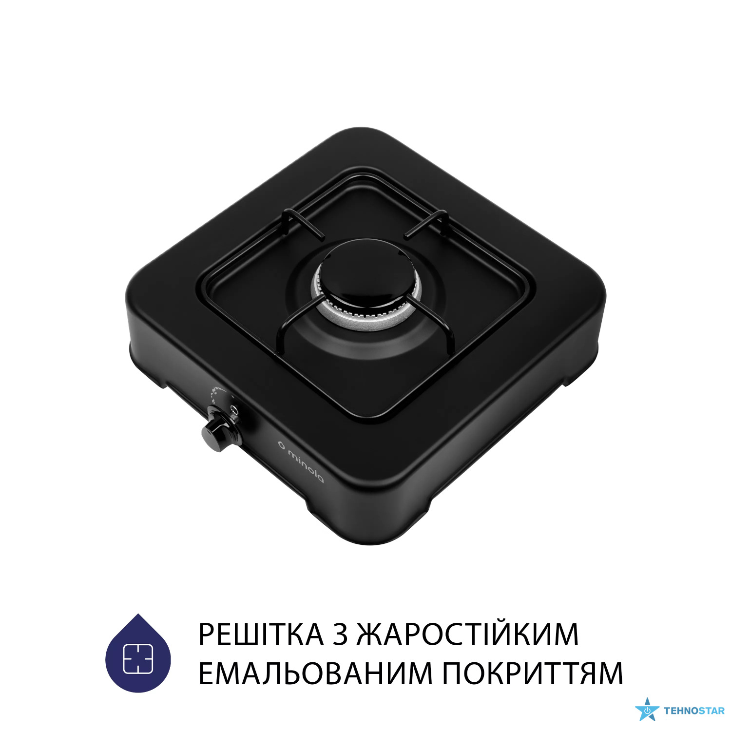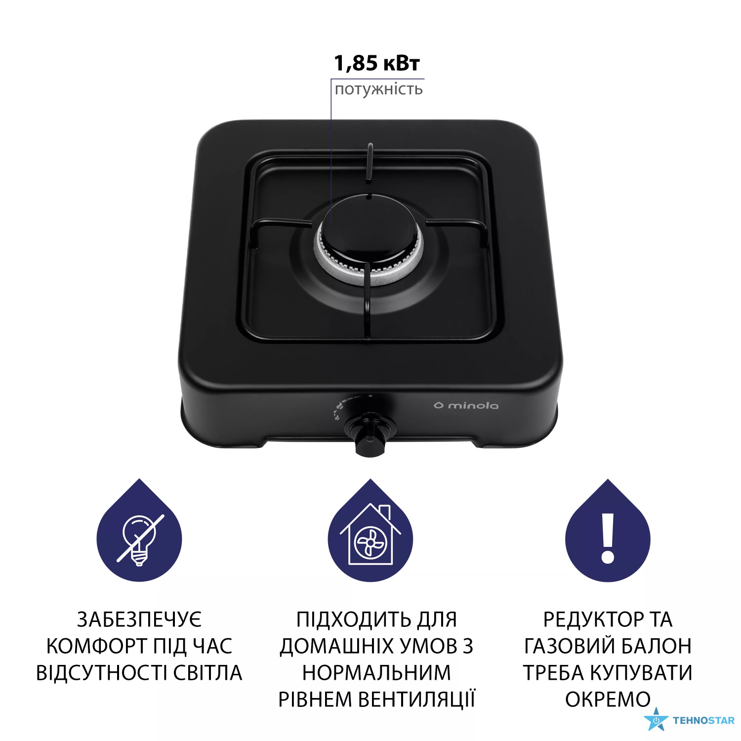 Газова настільна плита Minola TGH 100 BL — практичне рішення.Завдяки компактним розмірам і невеликій вазі її зручно переносити та використовувати в будь-якому місці.