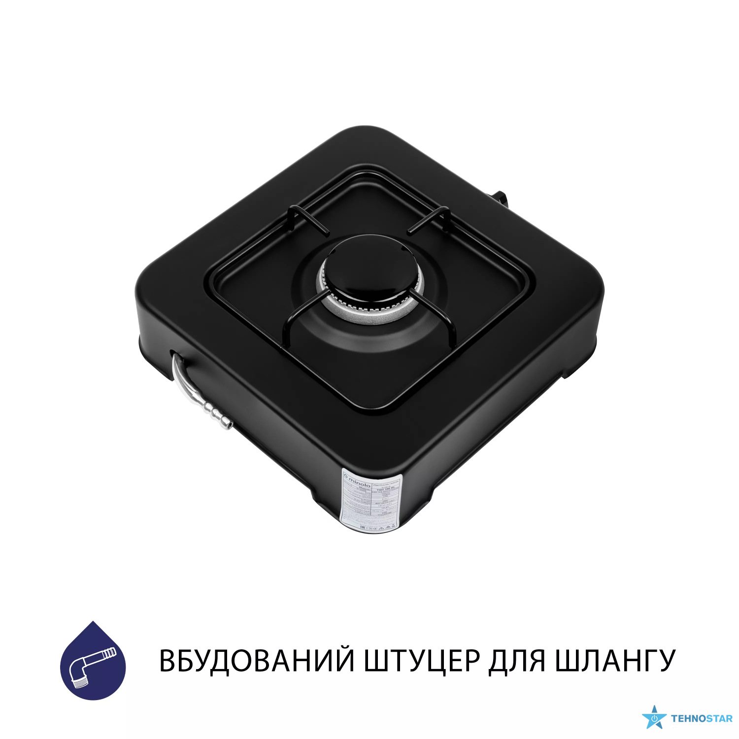 Модель має одну конфорку діаметром 6,5 см з потужністю 1,85 кВт. Ширина плити становить лише 30 см, завдяки чому вона легко розміщується на будь-якій рівній поверхні. У комплекті не передбачено газового балона.