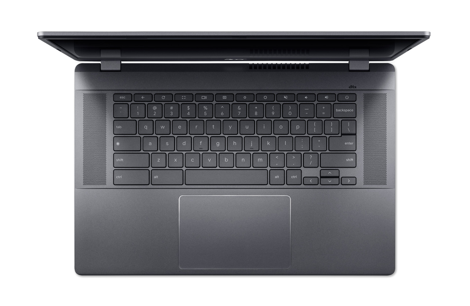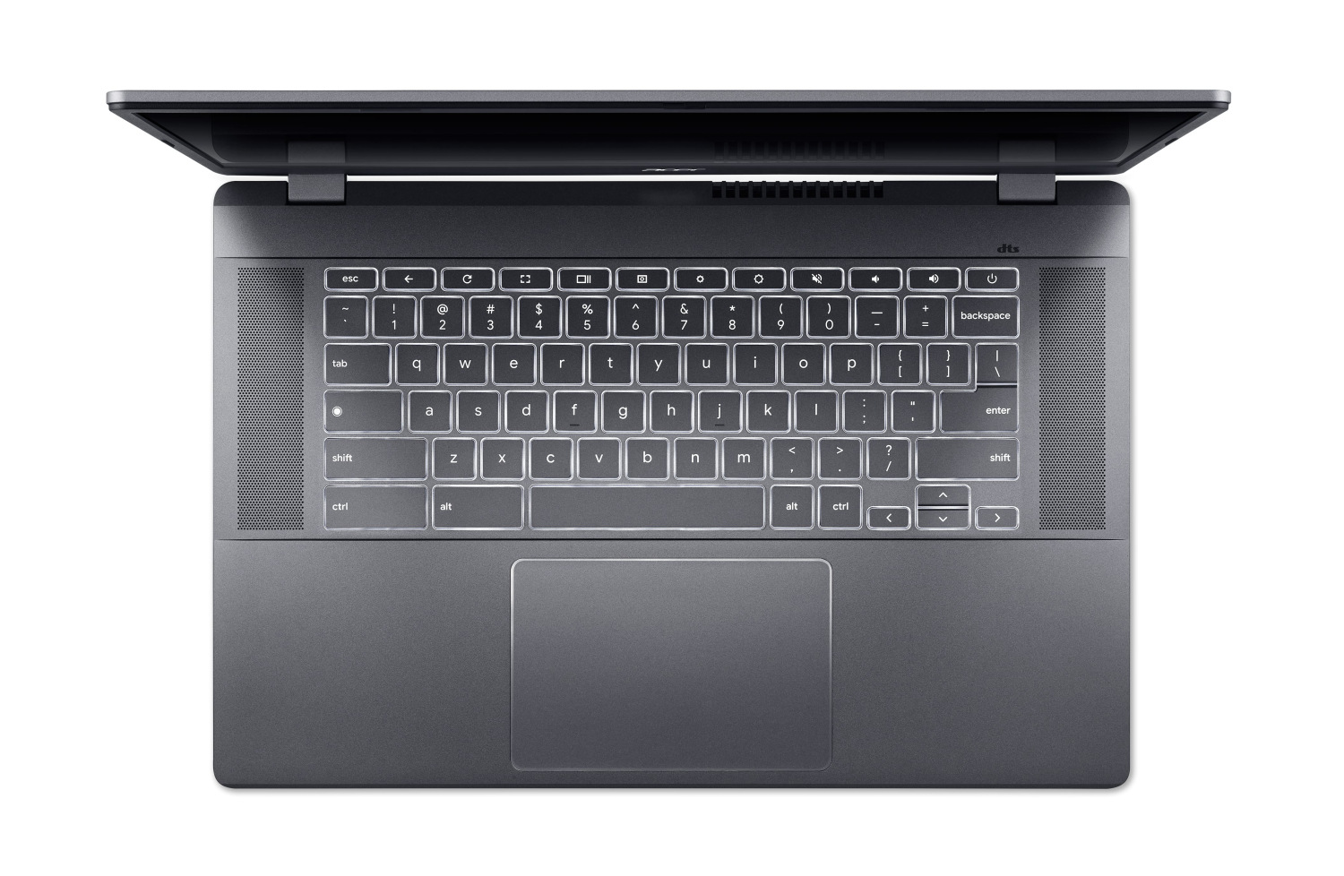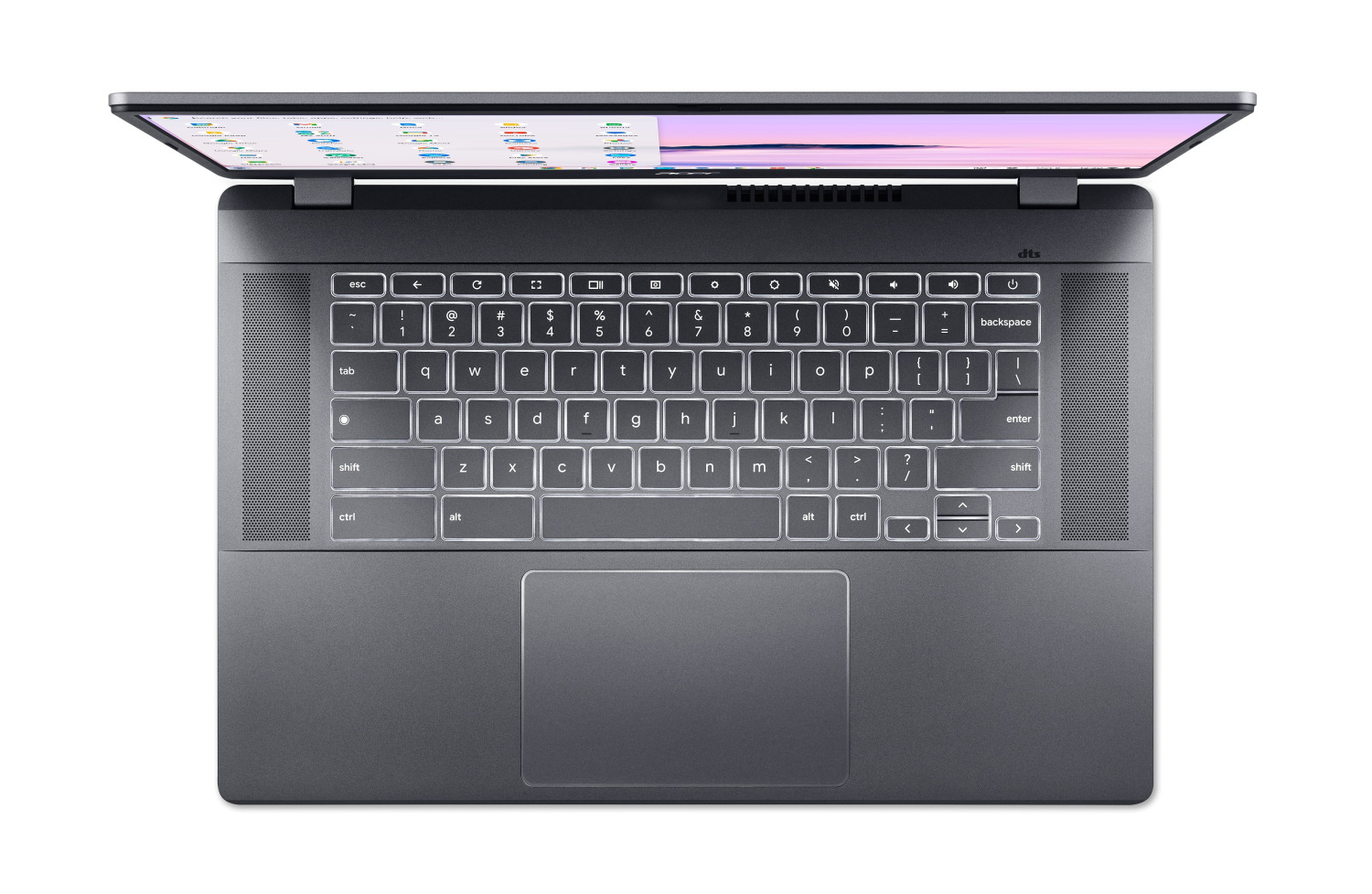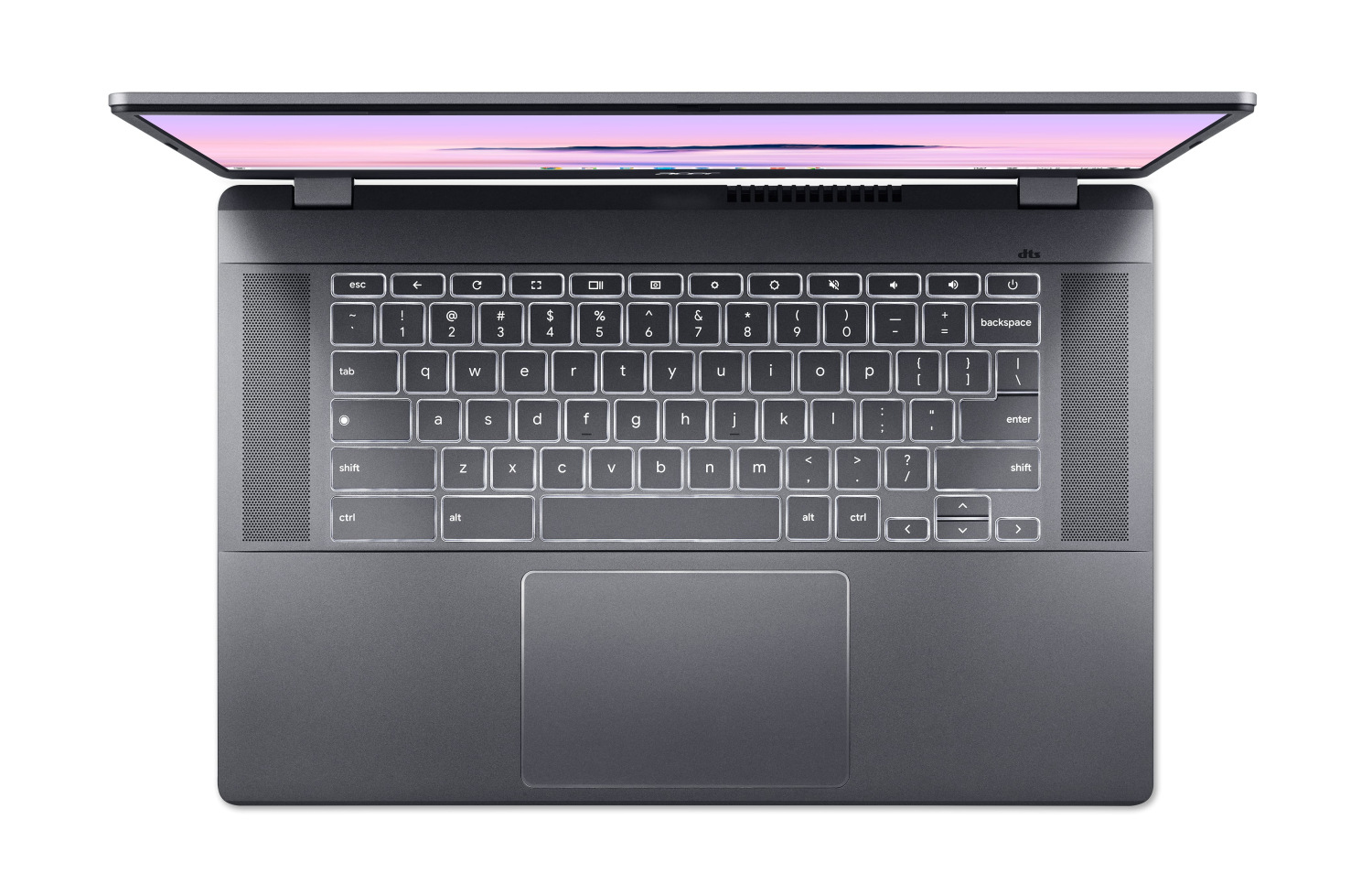 DTS® аудіо та акумулятор зі швидким заряджанням з 10 годинами автономної роботи6 роблять 15-дюймовий Chromebook Plus ідеальним для розваг у дорозі. Візьміть його з собою практично будь-куди навіть без адаптера та насолоджуйтесь високоякісним звуком із двох спрямованих угору динаміків.