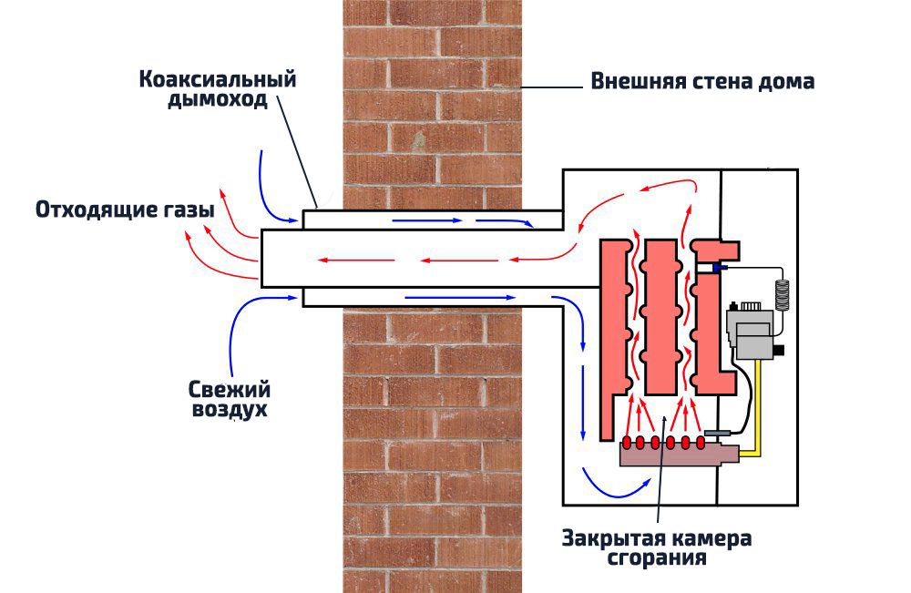 Сгорание газа происходит в закрытой топочной камере, которая герметична по отношению к отапливаемому помещению. Воздух нужный для горения газа поступает с улицы через коаксиальный дымоход за счёт самотяги аппарата. Таким же способом выводятся продукты горения. Такая конструкция позволяет устанавливать парапетные котлы в квартирах с плохой вентиляцией.