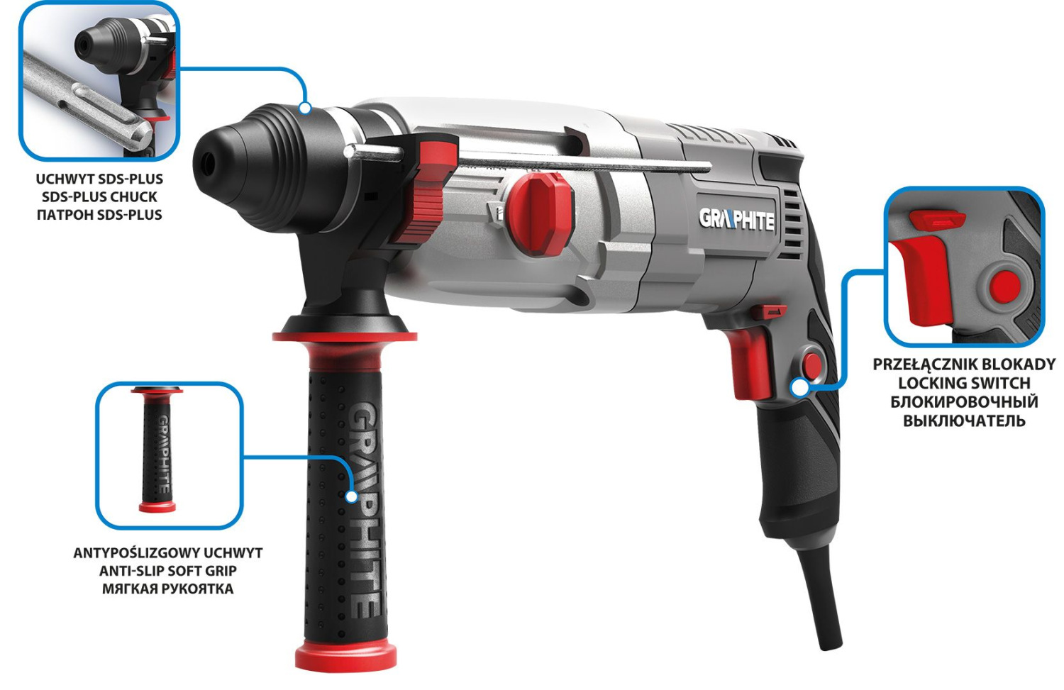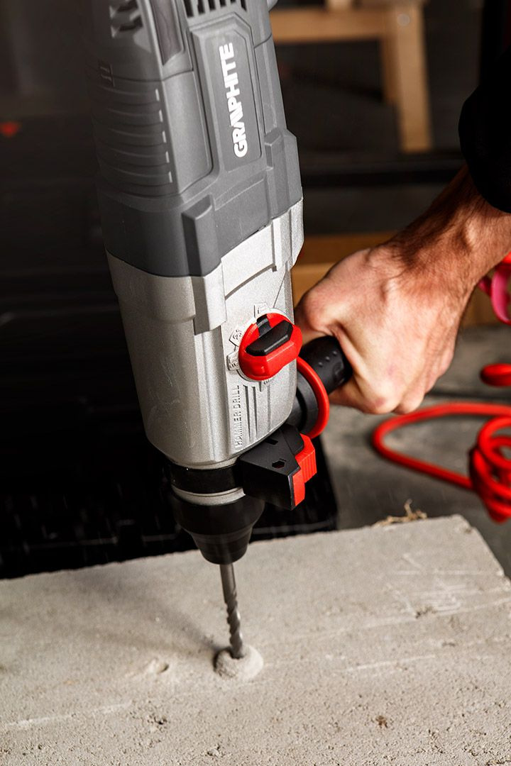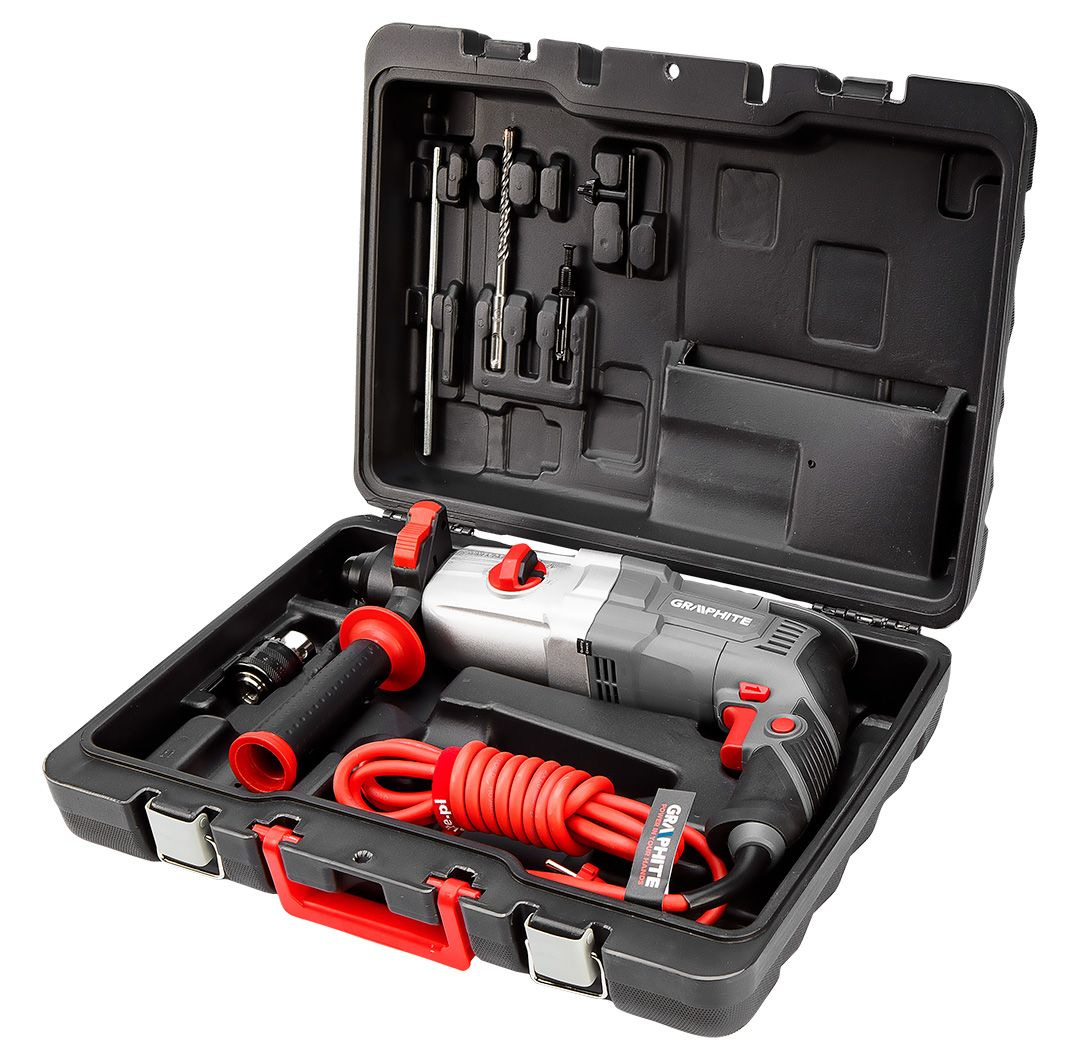 Ударний дриль-шуруповерт GRAPHITE 800 Вт, 2,8 Дж, SDS+, кейс 58G538 - це спеціалізований інструмент потужністю 800 Вт SDS+ з функціями свердління, ударного свердління, довбання та безступінчастим регулюванням кута нахилу зубила для точного довбання. Він може свердлити отвори діаметром до 26 мм у бетоні та цеглі, 13 мм у сталі та 30 мм у дереві. Інструмент має реверс шпинделя, плавне регулювання швидкості та блокування вимикача для безперервної роботи.