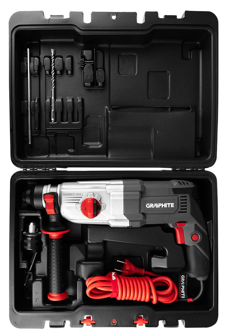 Ударний дриль-шуруповерт SDS+ 900 Вт, 3,4 Дж, кейс 58G539 від GRAPHITE - це спеціалізований інструмент з патроном SDS+ потужністю 900 Вт з функціями свердління та ударного свердління. Він може свердлити отвори діаметром до 28 мм у бетоні та цеглі, 13 мм у сталі та 30 мм у дереві. Інструмент має реверс шпинделя, плавне регулювання швидкості та блокування вимикача для безперервної роботи. Під час свердління ударний дриль розвиває до 950 обертів на хвилину, а при переході в ударний режим - до 5300 ударів на хвилину (функція удару активується при притисканні свердла до просвердлюваної поверхні).