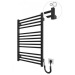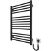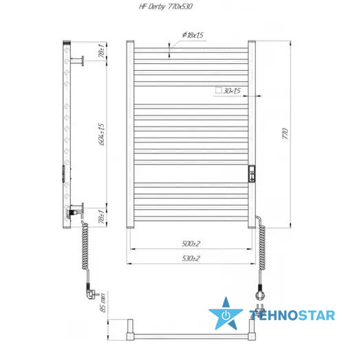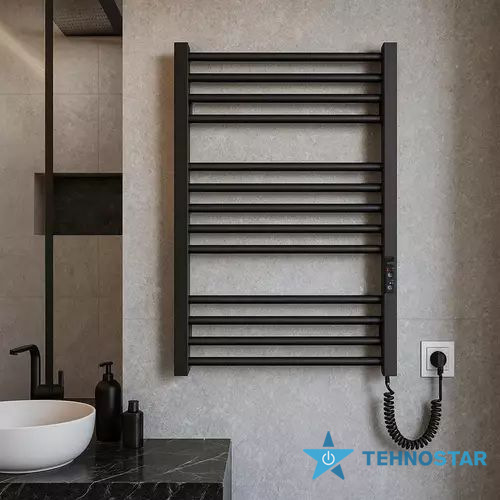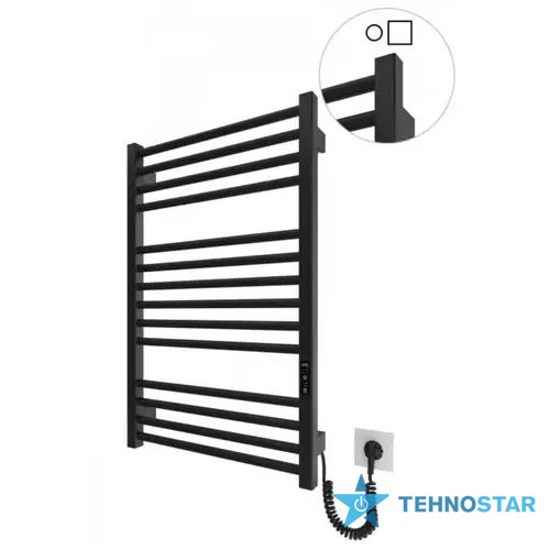 Електрична рушникосушарка HF Derby 770x530. Працює за технологією сухого ТЕНу. Обладнана вбудованим таймер-регулятором і конектором для підключення до живлення з будь-якого боку. Оснащена комплектом для прихованого підключення. Модель має 14 ребер з круглої труби та стійки з квадратного профілю. Матеріал - чорна сталь з антикорозійною обробкою. Варіанти покриття: чорний мат або білий мат. Температурні режими таймер-регулятора: 40°С, 45°С, 50°С. Час роботи: 3, 6 годин або постійний нагрів.