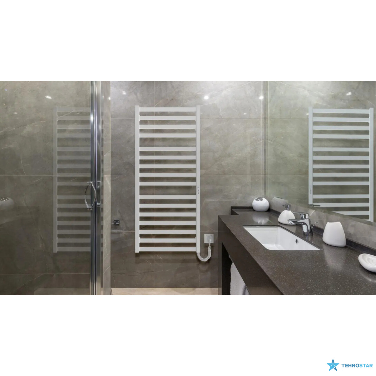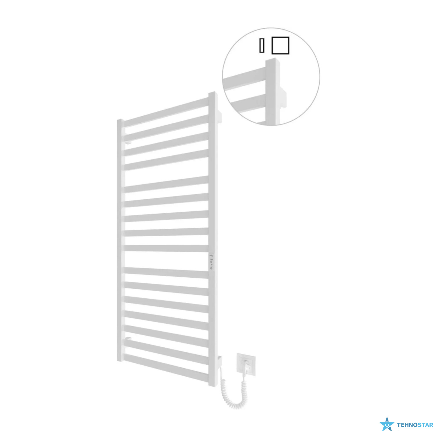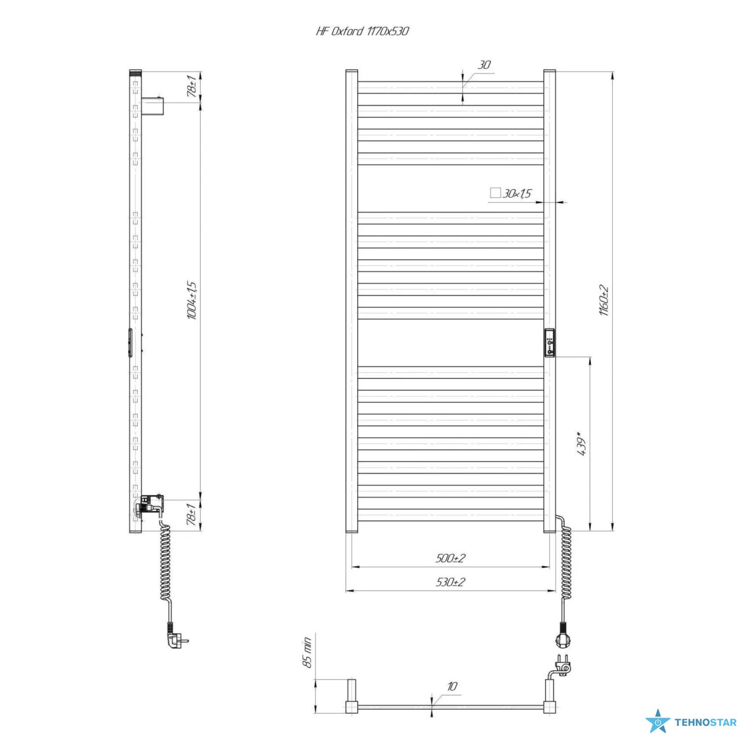 Електрична рушникосушарка HF Oxford 1170х530. Працює за технологією сухого ТЕНу. Обладнана вбудованим таймер-регулятором і конектором для підключення до живлення з будь-якого боку. Оснащена комплектом для прихованого підключення. Модель має 16 ребр з прямокутногої труби та стійки з квадратної труби. Матеріал - чорна сталь з антикорозійною обробкою(фосфотація). Варіанти покриття: чорний мат або білий мат. Температурні режими таймер-регулятора: 40°С, 45°С, 50°С. Час роботи: 3, 6 годин або постійний нагрів.