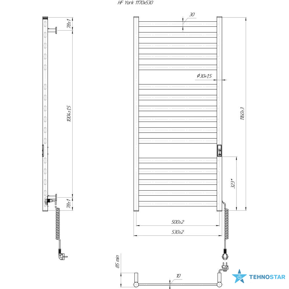 Електрична рушникосушарка HF York 1170х530. Працює за технологією сухого ТЕНу. Обладнана вбудованим таймер-регулятором і конектором для підключення до живлення з будь-якого боку. Оснащена комплектом для прихованого підключення. Модель має 16 ребр з прямокутногої труби та стійки з круглої труби. Матеріал - чорна сталь з антикорозійною обробкою. Варіанти покриття: чорний мат або білий мат. Температурні режими таймер-регулятора: 40°С, 45°С, 50°С. Час роботи: 3, 6 годин або постійний нагрів.