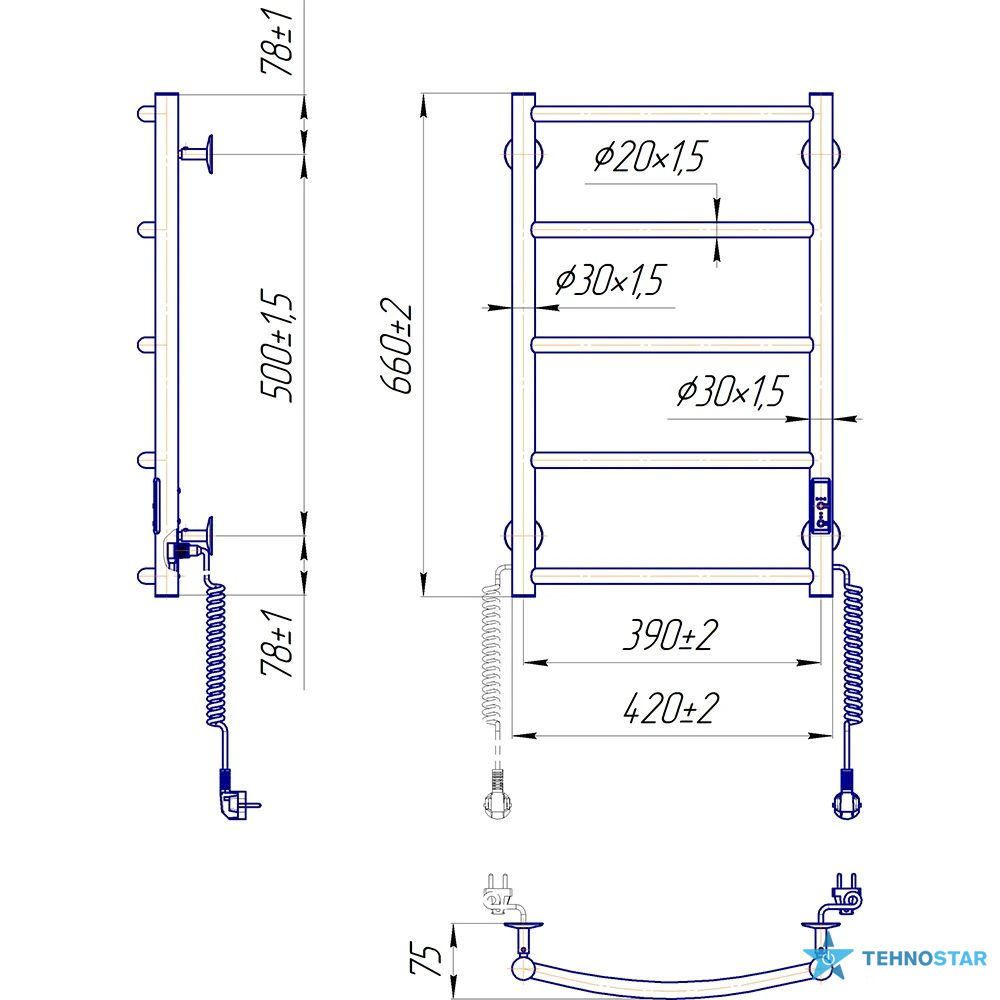 Сушка для рушників оснащена електронним управлінням з терморегулятором, що дозволяє точно налаштовувати температуру в залежності від ваших уподобань. Розміщення вимикача праворуч забезпечує зручний доступ та простоту використання. Глибина з урахуванням кріплення становить 75 мм, що дозволяє оптимально використовувати простір у ванній кімнаті.