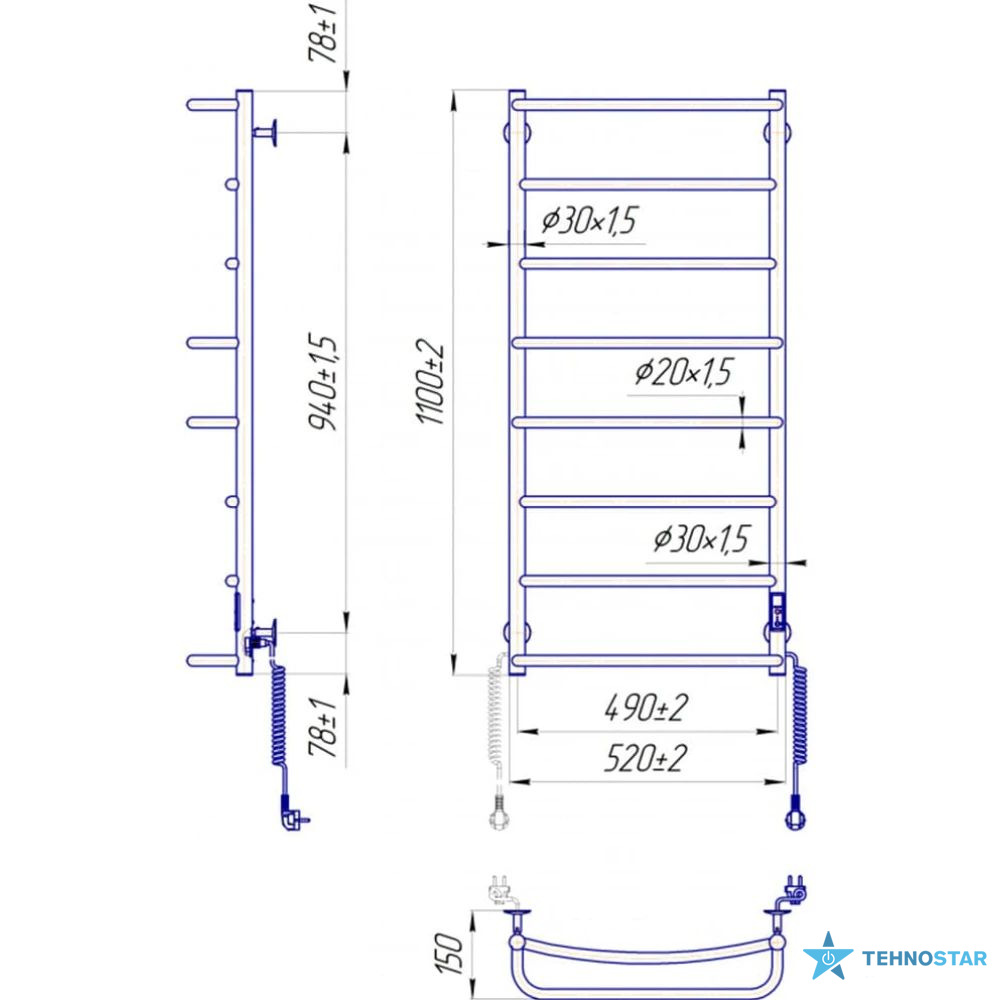 Габарити сушки для рушників складають 1090 х 530 х 150 мм, що дозволяє йому легко вписатися в будь-яке приміщення. Розміщення вимикача праворуч забезпечує зручний доступ до керування. Потужність пристрою складає 145 Вт, що достатньо для ефективного обігріву та сушіння рушників. Глибина з урахуванням кріплень складає 150 мм, що робить його компактним та зручним у встановленні.