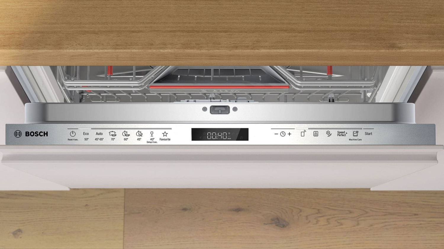 Посудомийна машина Bosch поєднує вбудовувану конструкцію, місткість на 14 комплектів і дистанційне керування через Home Connect. Модель оснащена системою сушіння з теплообмінником, автоматичним відчиненням дверцят і набором програм для різних сценаріїв миття.