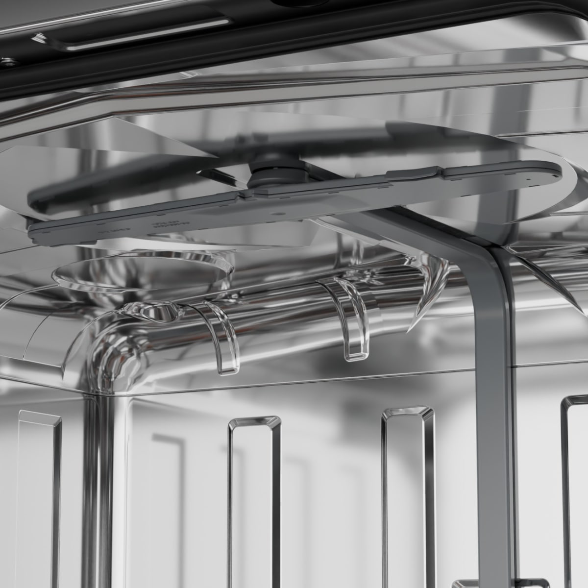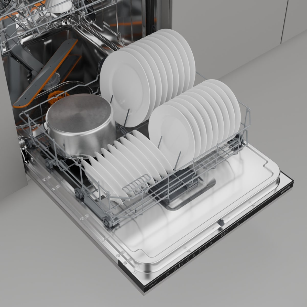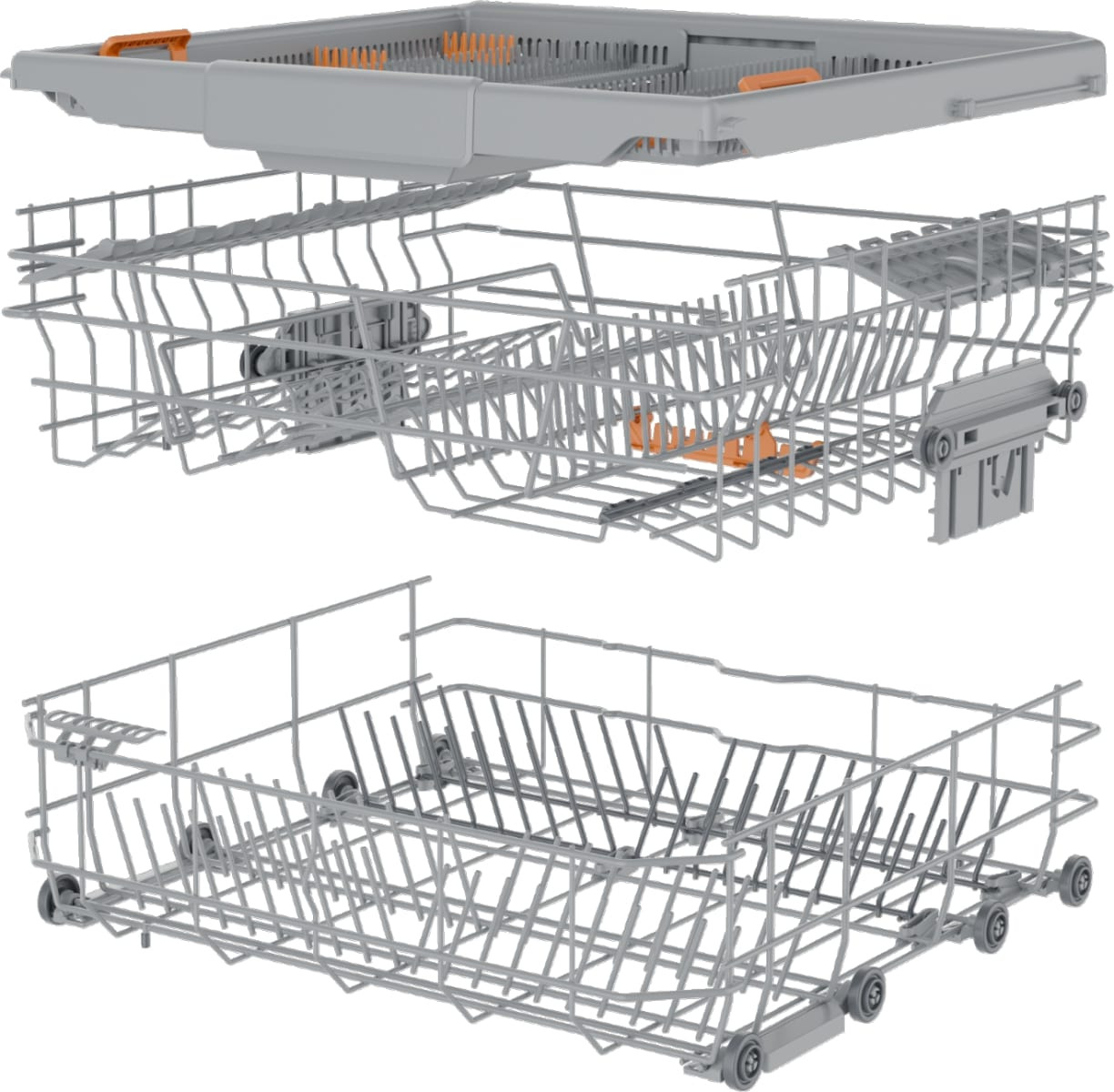 Кошики оснащені виділеними рухомими елементами та мають можливість індивідуального налаштування для зручного завантаження. Проста система регулювання кошика на двох рівнях дозволяє розмістити навіть найбільші каструлі та тарілки. Тримачі для тарілок у нижньому кошику можна легко скласти. Столові прибори зручно розміщуються на спеціальному піддоні, де вони розташовані окремо для ідеального очищення та сушіння. Кожна деталь продумана для максимально зручного користування.