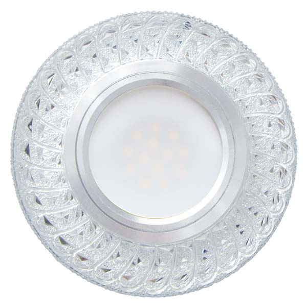Вбудований світильник зі світлодіодним підсвічуванням(LED стрічка в основі). Таким чином він оснащений двома джерелами світла: цоколем G5.3 під світлодіодну лампу типу MR-16, та світлодіодною підсвіткою по периметру світильника. Лампу та світлодіоди підсвітки можна підключати окремо та використовувати як різни типи освітлення. Світлодіоди світильника можуть працювати без вмикання лампи. Рекомендовано використовувати тільки зі світлодіодними лампами та з дистанційними вимикачами Feron. Технічні характеристики можуть змінюватися в залежності від партії