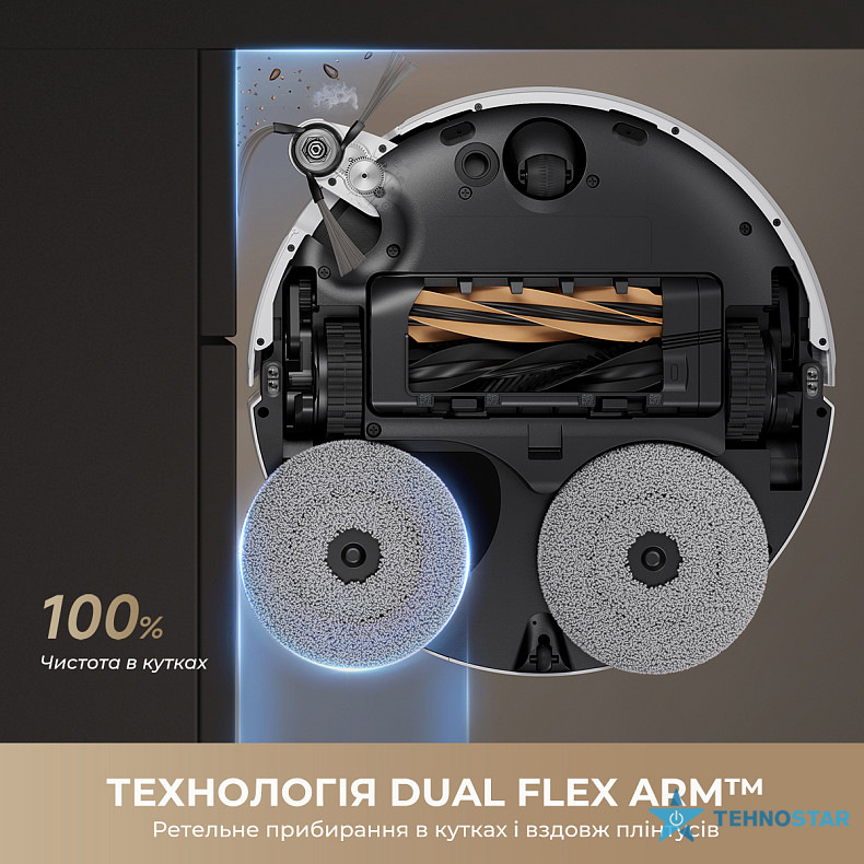 Час забути про пил у кутах кімнати. З технологією MopExtend Robo Swing мийні насадки можуть висуватися до 4 см за межі корпусу робота. А пилосос ефективно очищує підлогу під меблями та в кутах. Технологія SideReach передбачає використання висувної бічної щітки, яка розширює зону прибирання та ефективно очищає зону уздовж плінтусів.