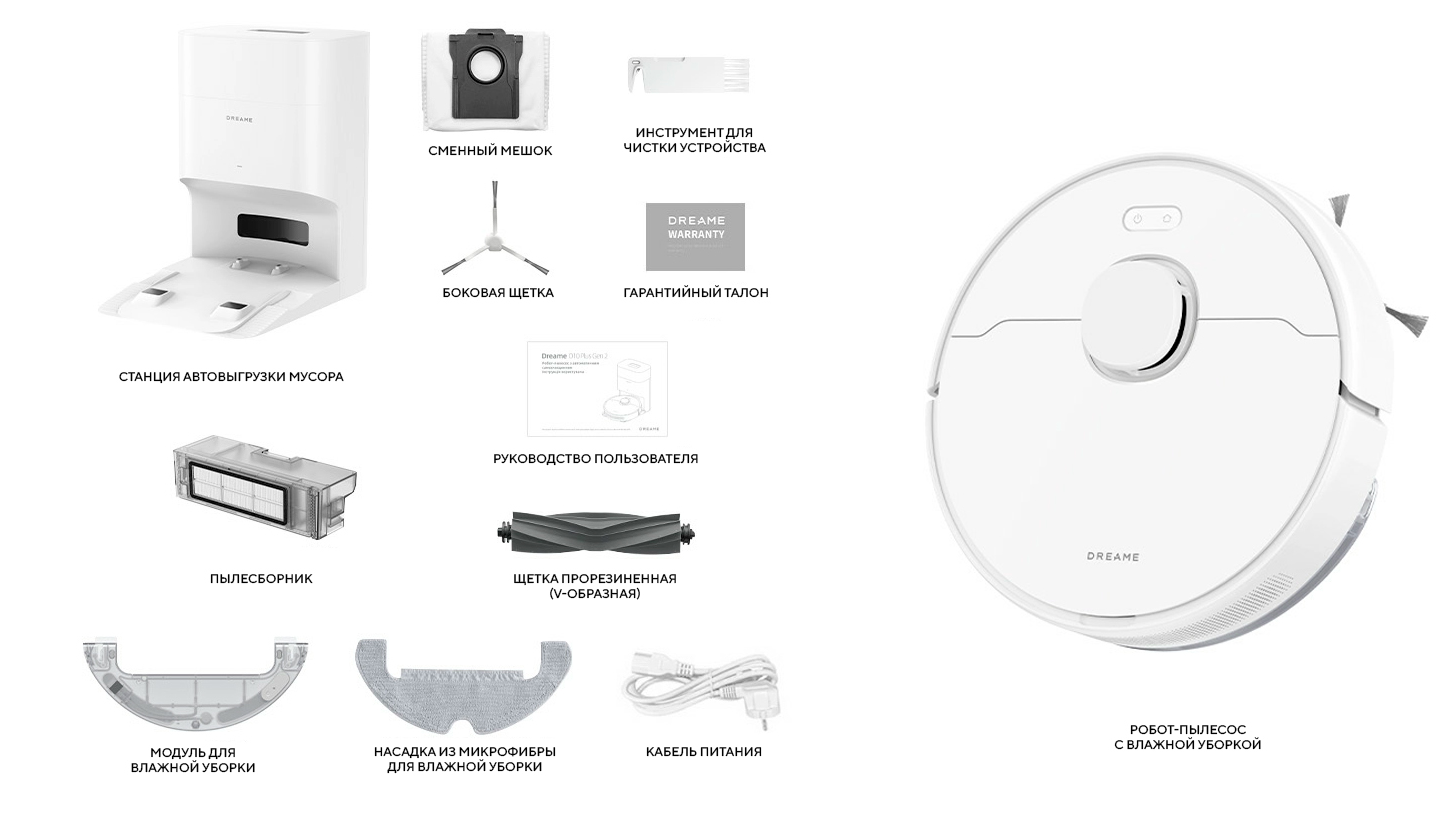 До Dreame D10 Plus Gen 2 додається зарядно-очисна станція, адаптер живлення, пилозбірник, два змінні мішки для збору пилу, основна щітка, бічна щітка, резервуар для води, миюча насадка, інструмент для очищення пилососу.