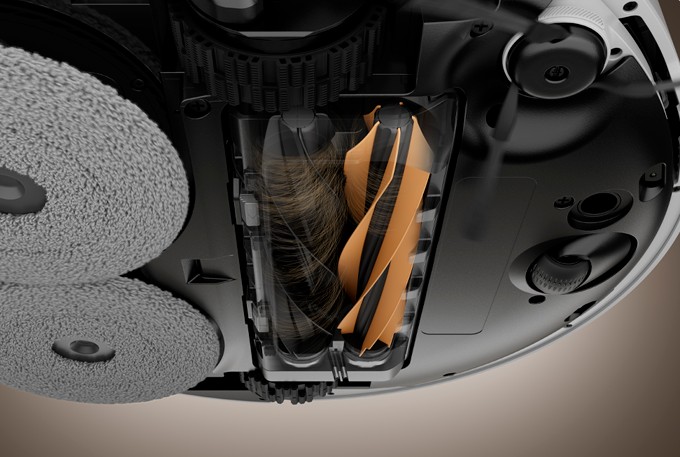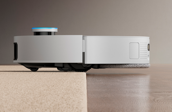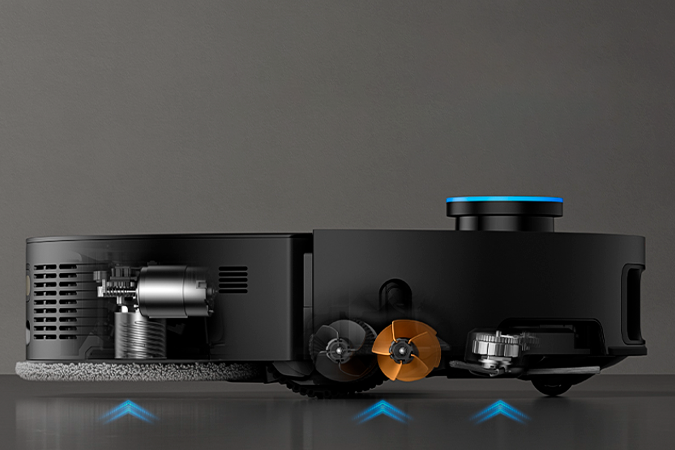 X50 Ultra Complete синхронно підіймає щітки та мийний модуль, коли це потрібно — розумно, швидко, без вашої участі. Припустимо, система виявляє зміну типу поверхні або зону, де не потрібно вологе прибирання — наприклад, на килимі. Робот миттєво активує систему підйому: ганчірки відриваються від підлоги, за потреби — бічна та центральна щітки роблять те саме. Після переходу в іншу зону, наприклад, на плитку — механізм опускається назад. Так волога ганчірка не забруднить ворс, а робот плавно проходитиме перешкоди — не зачепившись насадками за килим.
