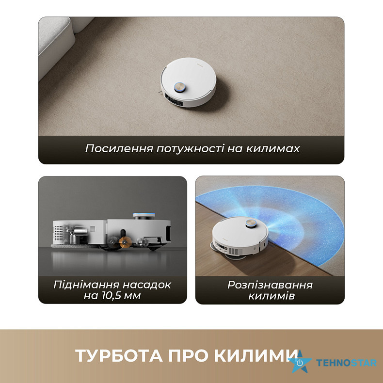 Здається, для сухого очищення мийні швабри — не потрібні. Один з варіантів — Dreame може просто зняти їх на станції. Крім того, він може підіймати швабри на 1.05 см для невисоких килимів чи просто уникати ворсового покриття, щоб не намочити та залишити його чистим. Для килимів також передбачено режим глибоко очищення, що посилює всмоктування до максимуму.