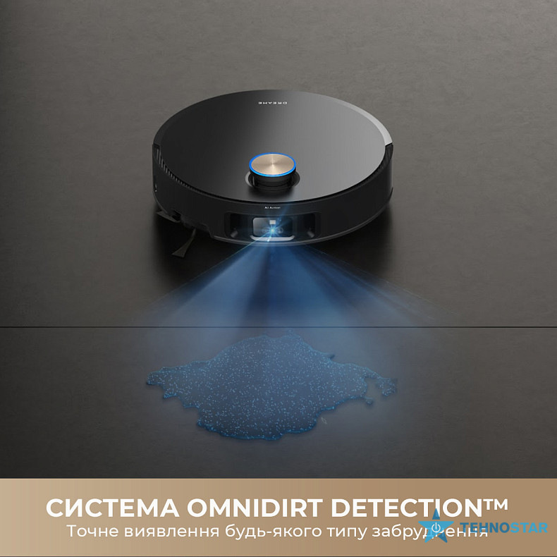 Замість сліпої навігації X50 Ultra Complete використовує систему OmniDirt Detection — "розумний зір" пилососа. Мультиспектральний сенсор аналізує тип забруднення: він бачить різницю між розлитою кавою, слідами лап чи пилом у щілині. Після цього робот автоматично підлаштовує потужність, маршрут і кількість проходів, фокусуючись на більш забруднених зонах. Навіть вода, яка залишила пляму після першого прибирання, не залишиться поза увагою — Dreame її розпізнає та видалить повністю.