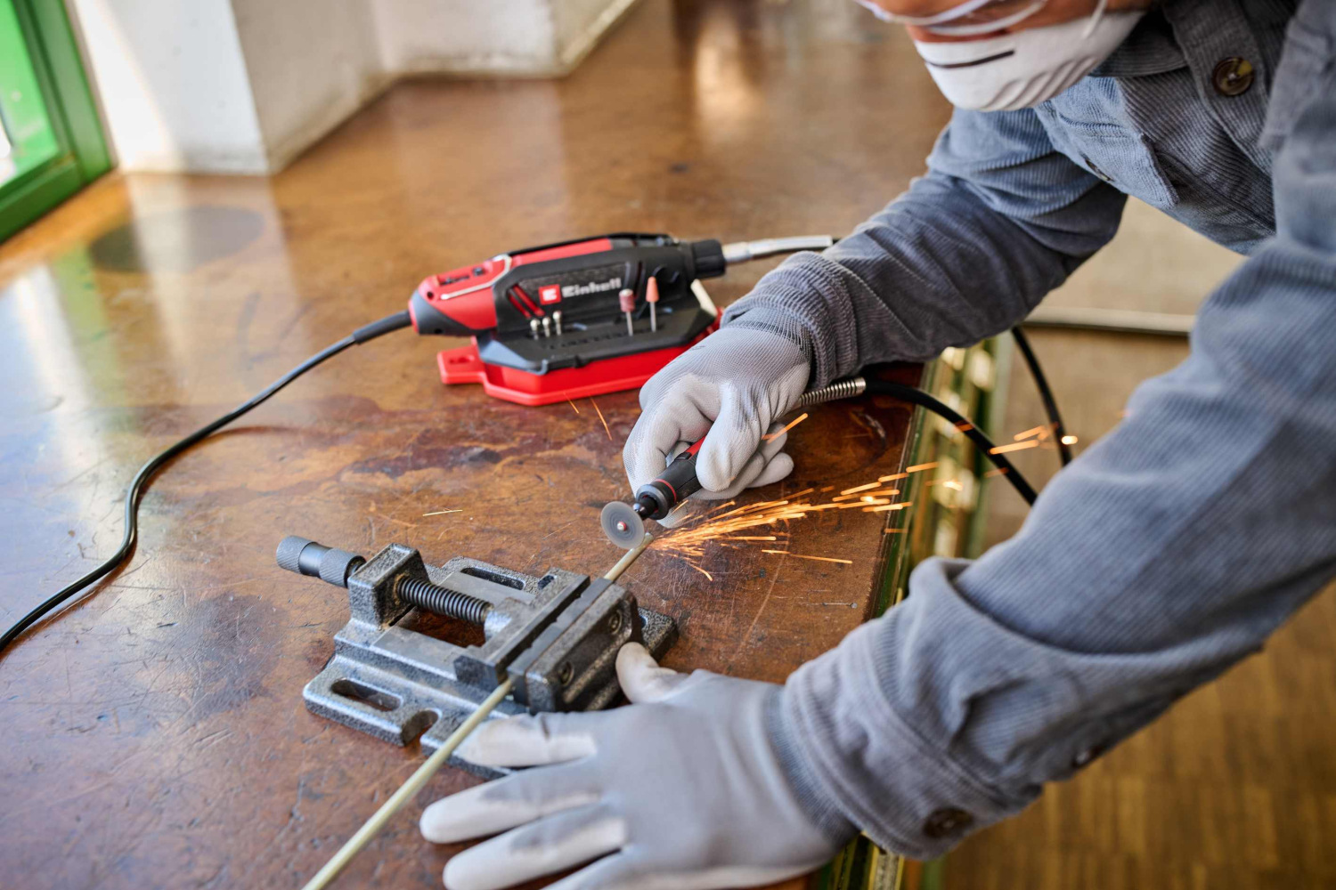 Універсальний шліфувально-гравірувальний інструмент Einhell TC-MT 150 E можна використовувати для широкого спектру завдань, таких як гравірування, полірування, фрезерування, шліфування, різання та чищення. Завдяки 6-ступінчастій електроніці швидкості обертання потужність можна гнучко адаптувати до матеріалу та відповідного застосування, при цьому можлива швидкість від 10 000 до 35 000 обертів на хвилину. Блокування шпинделя забезпечує просту та зручну заміну насадок. Таким чином, завдяки олівцю, розташованому на гнучкому валу довжиною 10 см, можливе отримання точних результатів навіть для детальних завдань або складного гравіювання. Гравірувальний олівець ідеально лежить у руці завдяки своїй вузькій конструкції з м’якими поверхнями. Тримач пристрою, що входить у комплект, має практичне місце для зберігання ручки та олівця, а також тримач аксесуарів для часто використовуваних аксесуарів.