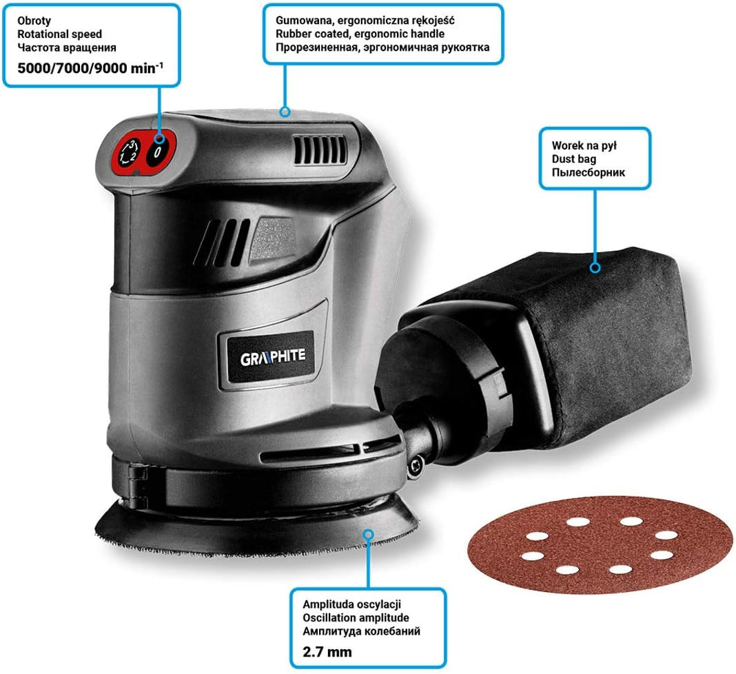 Електроінструмент працює на трьох швидкостях: 5000/7000/9000 об/хв., яким відповідає частота коливань: 10000/14000/18000 об/хв. Амплітуда коливань становить 2,7 мм. Область захоплення покрита антиковзним матеріалом, тому працювати з електроінструментом безпечно та комфортно – у тому числі й однією рукою. Шліфувальна машина оснащена ефективною системою видалення пилу, завдяки якій пил, що утворюється в процесі шліфування, не ускладнює роботу. У набір разом зі шліфувальною машиною входять: ємність з матерчатим фільтром, що збирає пил, а також шліфувальний папір.