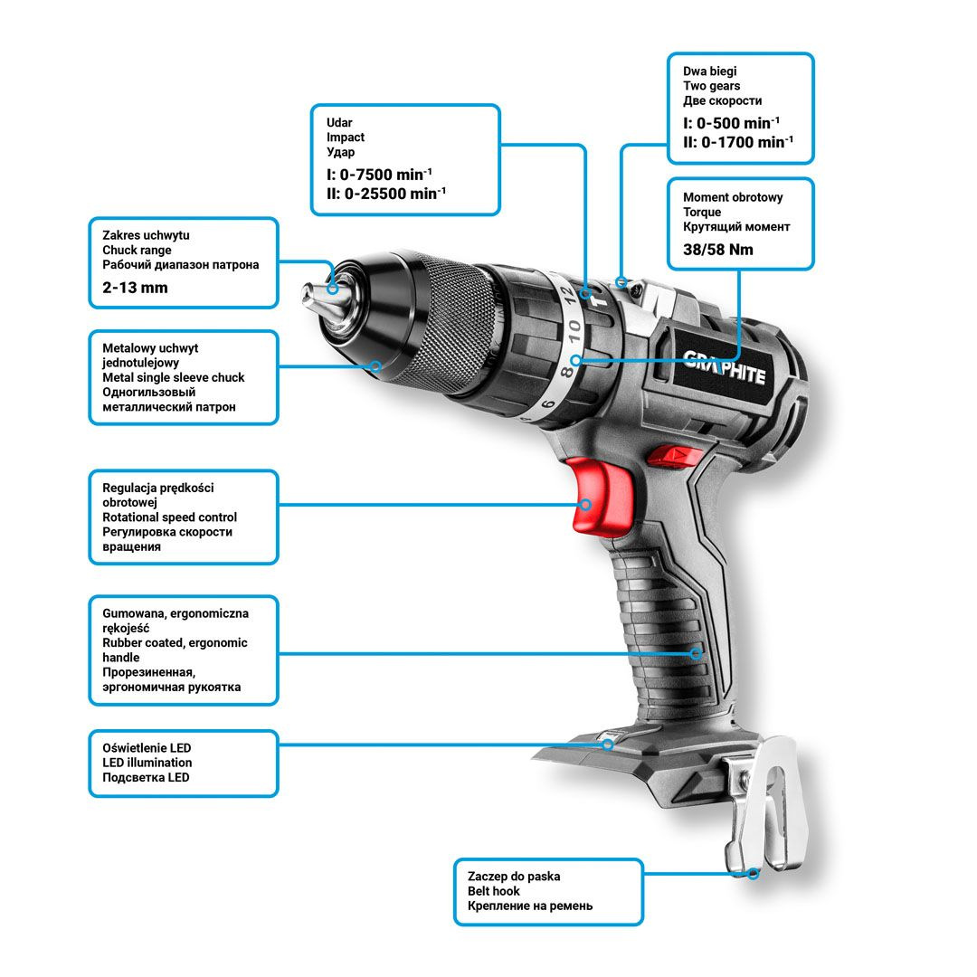 Акумуляторний ударний дриль-шуруповерт GRAPHITE 58G020 — це високоякісний інструмент, призначений для свердління, свердління з ударом та загвинчування в різних матеріалах, таких як дерево, метал та цегла. Завдяки безщітковому двигуну та ергономічному дизайну, цей інструмент забезпечує ефективну та комфортну роботу.