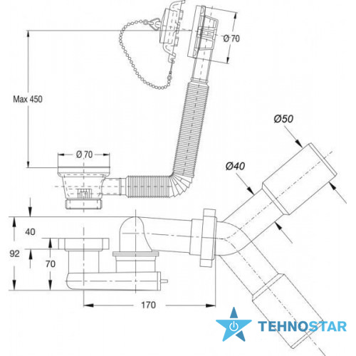 Cифон до ванни з гумовою пробкою, металева сітка, сифон стандартний, перелив пластик, зливна труба d40/50