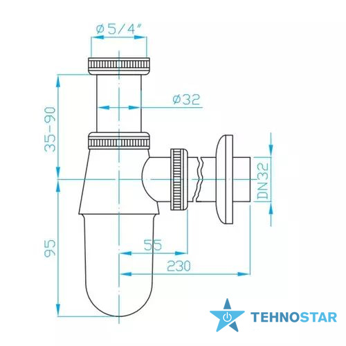 Представлений тут колбовий сифон для раковини виготовлений з якісної латуні в хромованому кольорі та оснащений діаметром підключення 1 1/4" з підведенням до каналізації діаметром 32 мм.