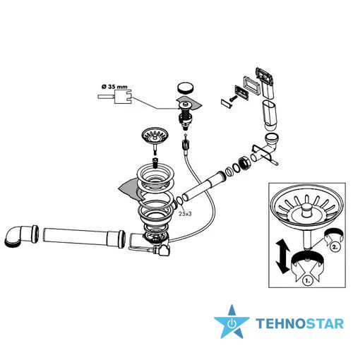 • 1 1/2" з компактною зливною трубою та сифоном проти запаху