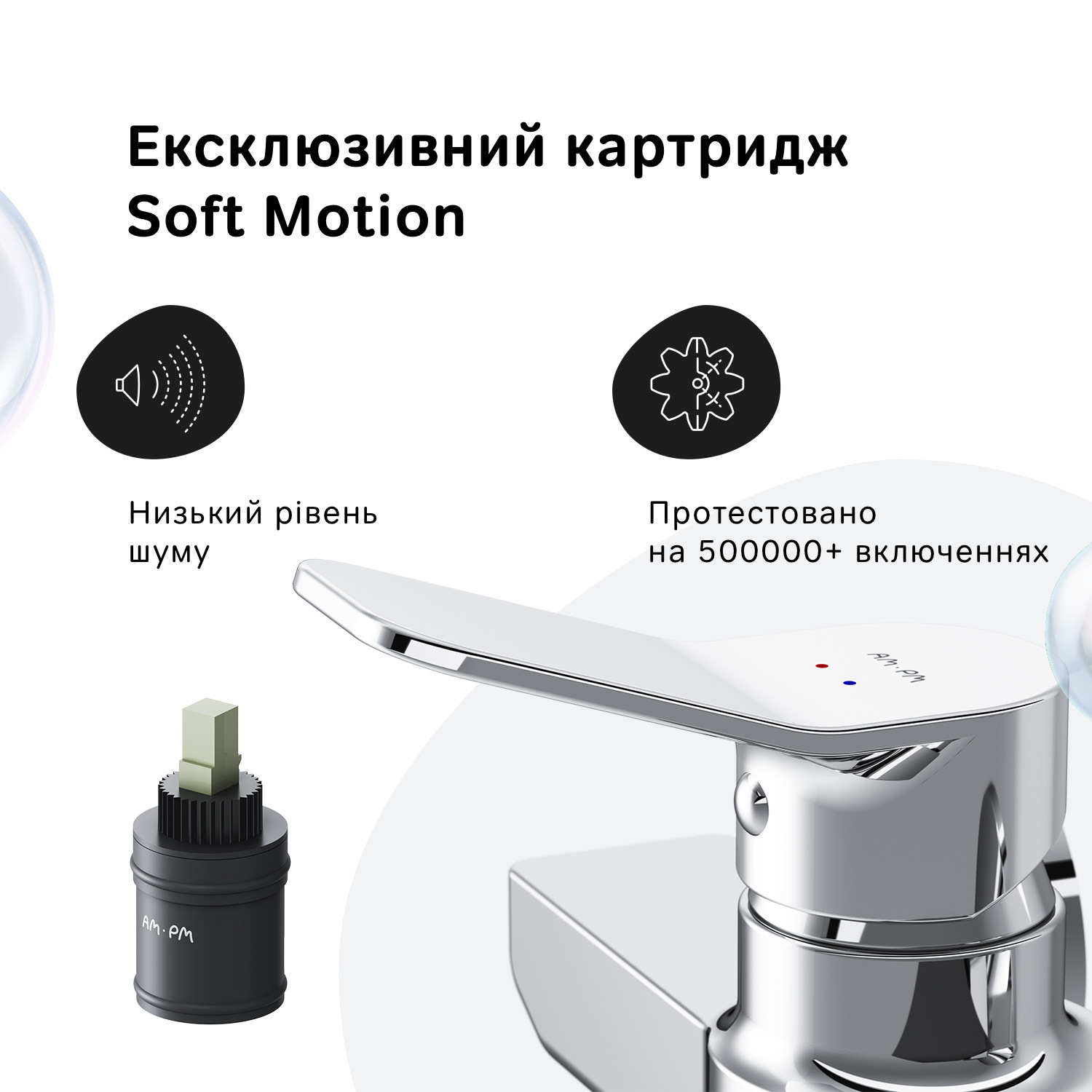 Змішувач X-Joy обладнаний спеціально спроектованим для AM.PM керамічним картриджем SoftMotion 35 мм, що забезпечує оптимальне регулювання температури, а також дозволяє витримувати будь-які перепади тиску.