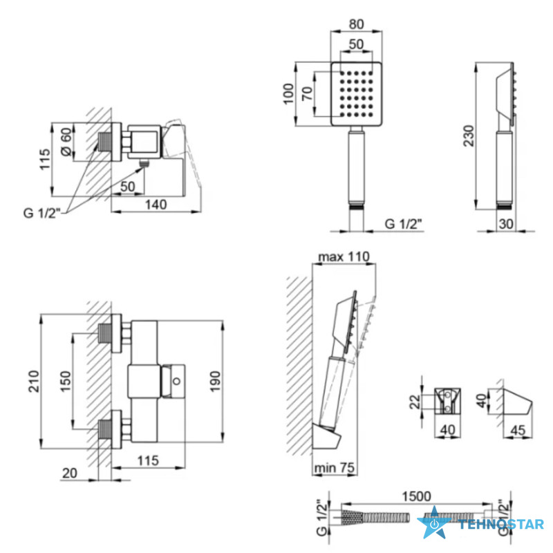 Гарнітур укомплектовано лійкою, шлангом, кронштейном та кріпленнями, тому змішувач готовий до встановлення. Управління дуже зручне — плавне регулювання температури та напору води гарантоване завдяки картриджу діаметром 35 мм.