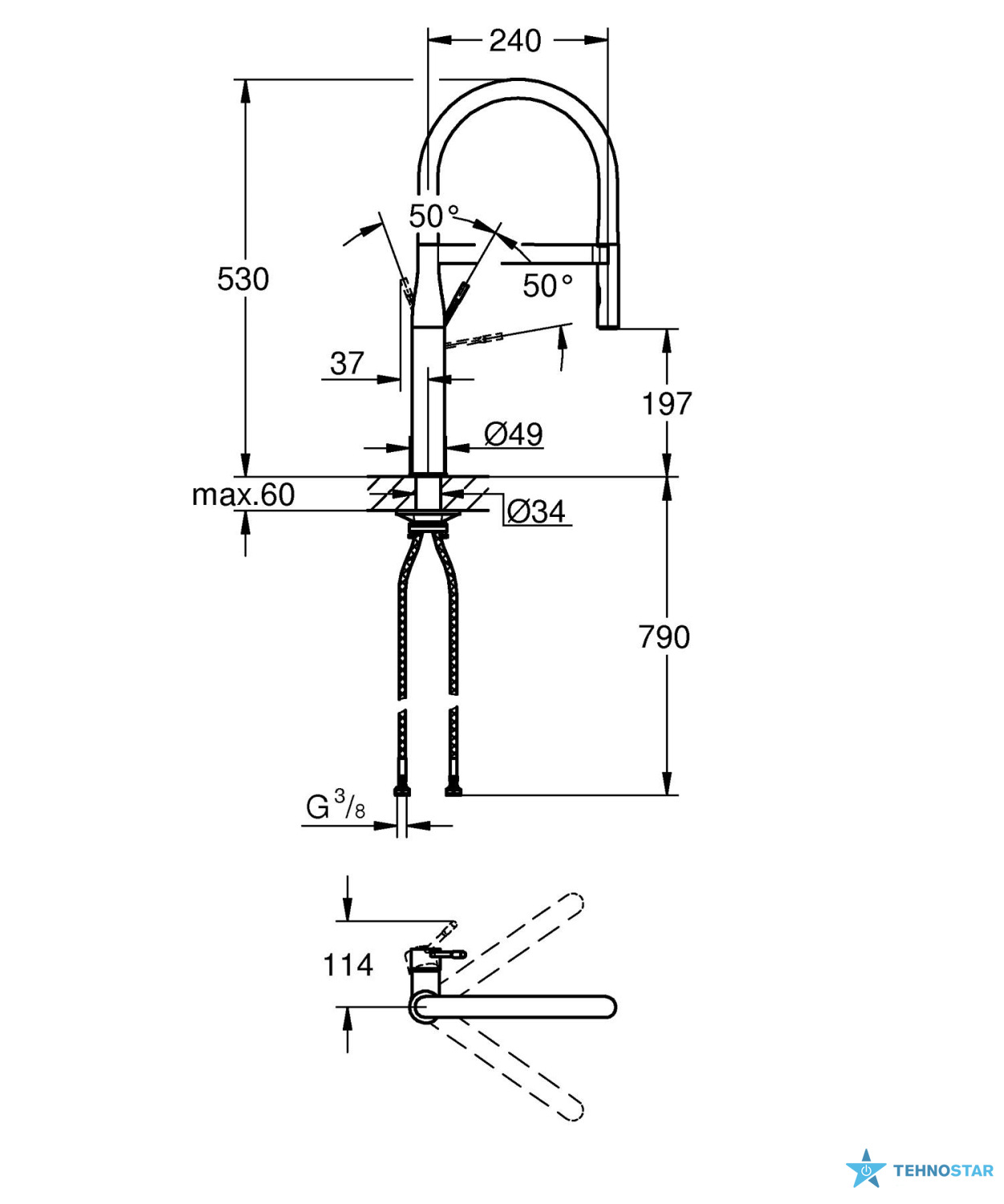 Змішувач оснащений професійною лійкою з гнучким силіконовим шлангом GROHFlexx, що дозволяє легко охоплювати навіть велику мийку з двома чашами. Завдяки системі Magnetic Docking розпилювальна головка після використання повертається на місце плавно й без зусиль. Це додає зручності та гарантує акуратний вигляд кухонної зони.
