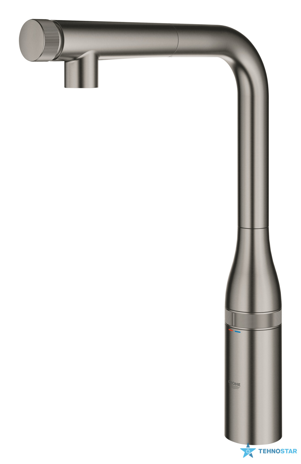 Центральним елементом взаємодії є революційна технологія GROHE SmartControl, яка повністю переосмислює концепцію керування водою. Більше немає потреби торкатися важеля брудними або зайнятими руками: інтелектуальна кнопка на кінці виливу дозволяє вмикати та вимикати потік легким натисканням ліктя або зап’ястя. Плавний поворот цієї ж кнопки забезпечує прецизійне налаштування напору — від економного струменя до потужного потоку, що дозволяє миттєво адаптуватися до будь-якого кухонного завдання, зберігаючи корпус змішувача бездоганно чистим.