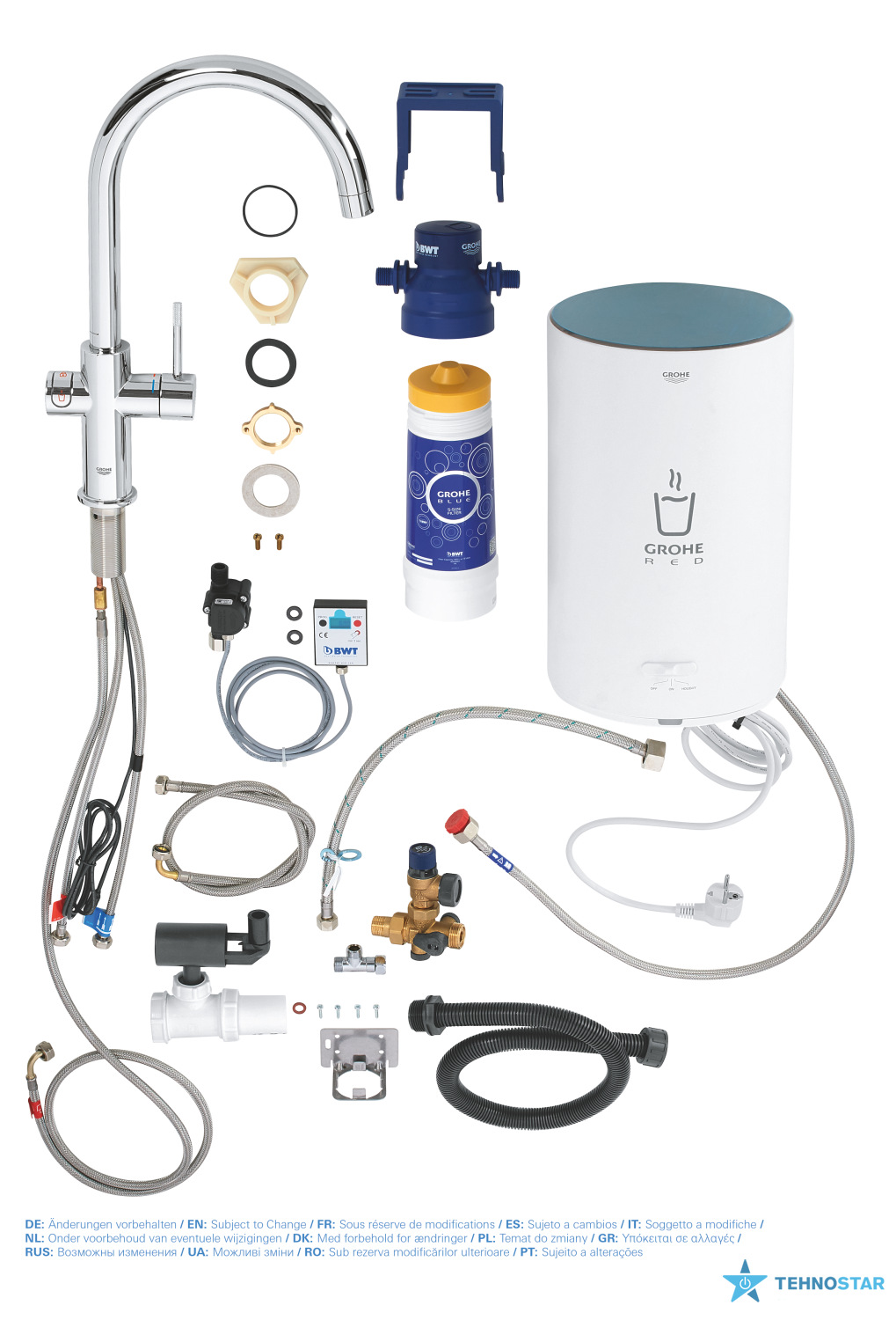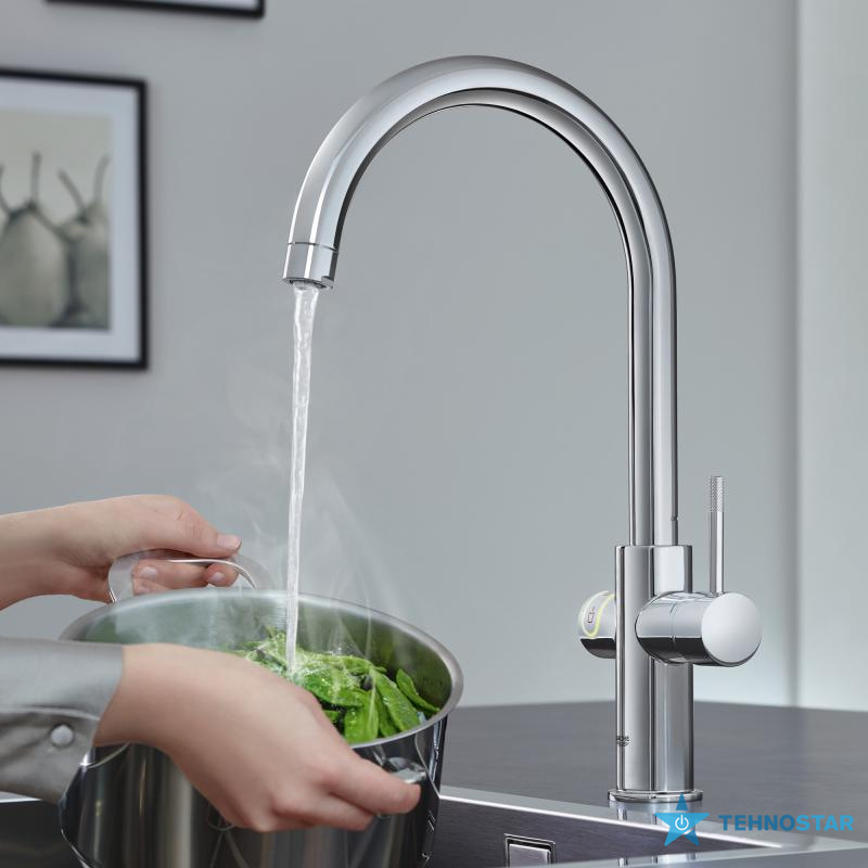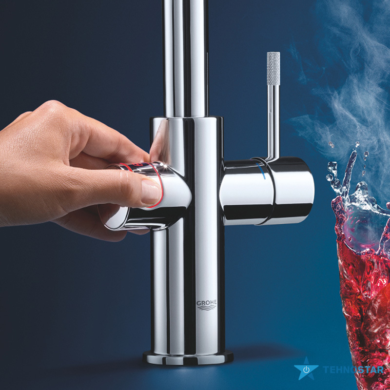 Ця система складається з одноважільного змішувача та бойлера, який забезпечує миттєву подачу киплячої води. Завдяки технології GROHE ChildLock та потрійній електронній системі захисту, користування абсолютно безпечне навіть у сім’ях із дітьми. Вода нагрівається до температури кипіння й подається через теплоізольований вилив, що виключає ризик випадкових опіків.