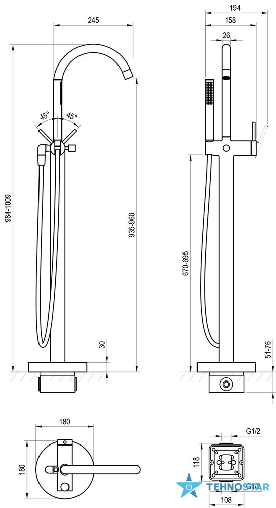 підходить: до ванн, що окремо стоять