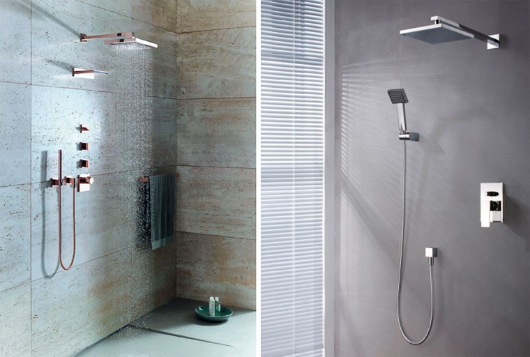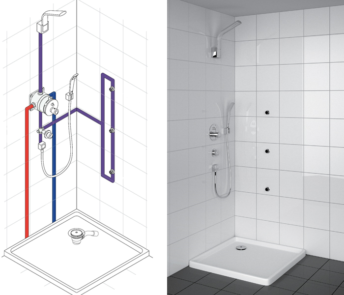 При установке традиционных приборов водопроводные трубы находятся в ванной комнате и подведены непосредственно к смесителю, так как устройство, регулирующее потоки воды, расположено в корпусе аппарата. Такое подключение не только занимает место, но и портит внешний вид ванной комнаты. Во встроенных моделях этот механизм устанавливается независимо от излива и монтируется в стену. На виду находится лишь лейка с аэратором и панель управления.